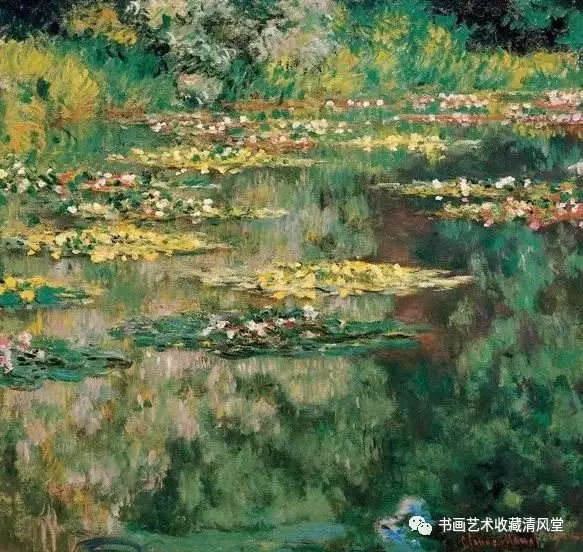 43岁的莫奈在吉维尼定居后,在庭院里修了一个池塘,在池塘里繁殖了睡莲,成为他晚年描绘的主要对象。这幅《睡莲》是莫奈64岁时所作的早期小幅作品。
