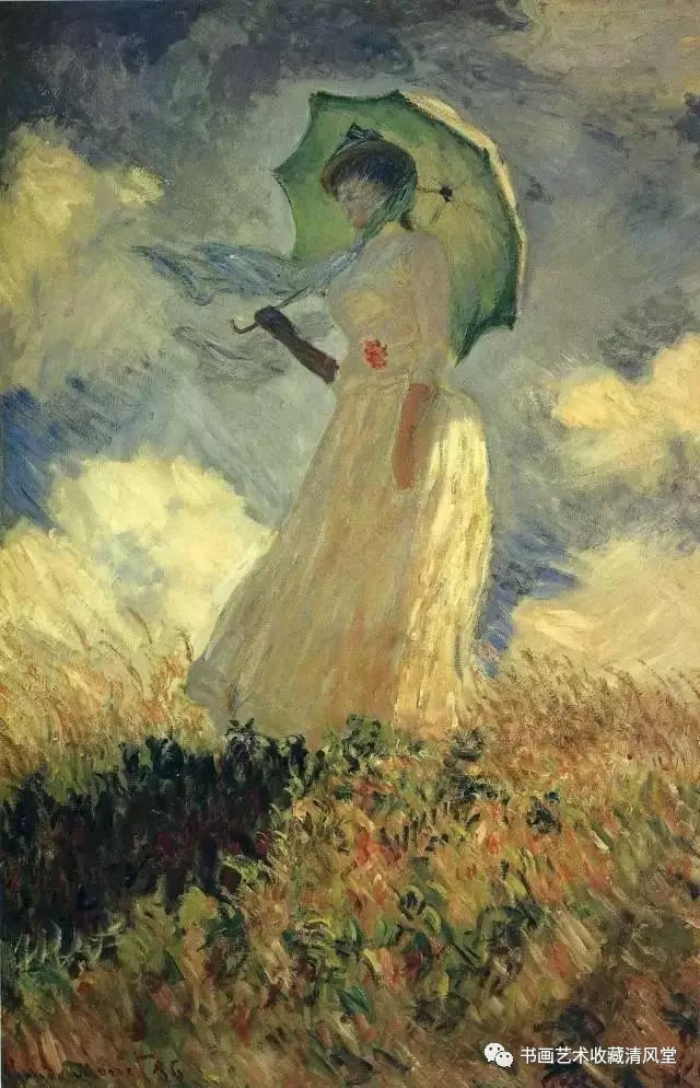 莫奈画于1886 年悼念亡妻卡美伊的作品。人物形象很模糊,连五官和表情都看不见,但随着笔触堆叠的方向,可以感受到草原上吹拂的微风和女子丝巾上跃动的阳光。卡美伊因病死于1879 年,时年37 岁,莫奈在同年画下了《临终的卡美伊》,画中以忧郁的色调、纷乱的笔法,传达出失去爱妻的悲伤。