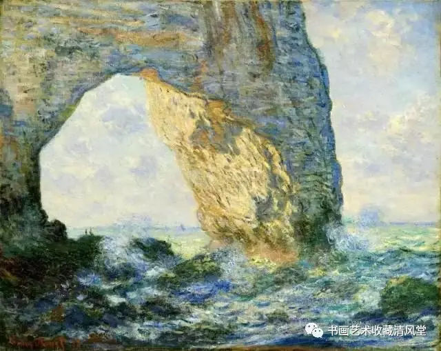 莫奈表现法国海岸浪潮波涛的层叠翻滚和变换,色彩和动感强烈,同时和上空漂浮的云彩形成了“浓妆淡抹”和“动静结合”的对比。