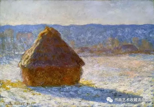 印象派认为真实是转瞬即逝的视觉印象,冲破了以往的绘画成见,直接用色彩来表达视觉。《干草堆》用的就是莫奈所擅长的纯色色点并置的技术,使观者获得色彩混合和震荡的独特的视觉感受.《干草堆》是莫奈的主题绘画系列之一,它记录了干草堆在一天不同时间光照下的色彩变化.印象派画家强调瞬间的视觉印象,其绘画表现的是一瞥的印象,一反以往那种追求精确逼真的绘画观念。倘若想在印象派绘画中寻找逼真的一面,那么就要远看。但印象派绘画吸引人的正是它的朦胧和色彩变化的微妙。干草堆,它的光影效果做的非常漂亮,实际上它是一个色彩印象,乍看上去,这仿佛是一个五岁小孩儿的信笔涂鸦。没有细部.不代表那真的是涂鸦! 莫奈不只满足于能够画他所看到的事物和按照他所看见的那种方式来做画;他想要创造一种独特的效果,达到一种在绘画上似乎是不可能达到的目的。