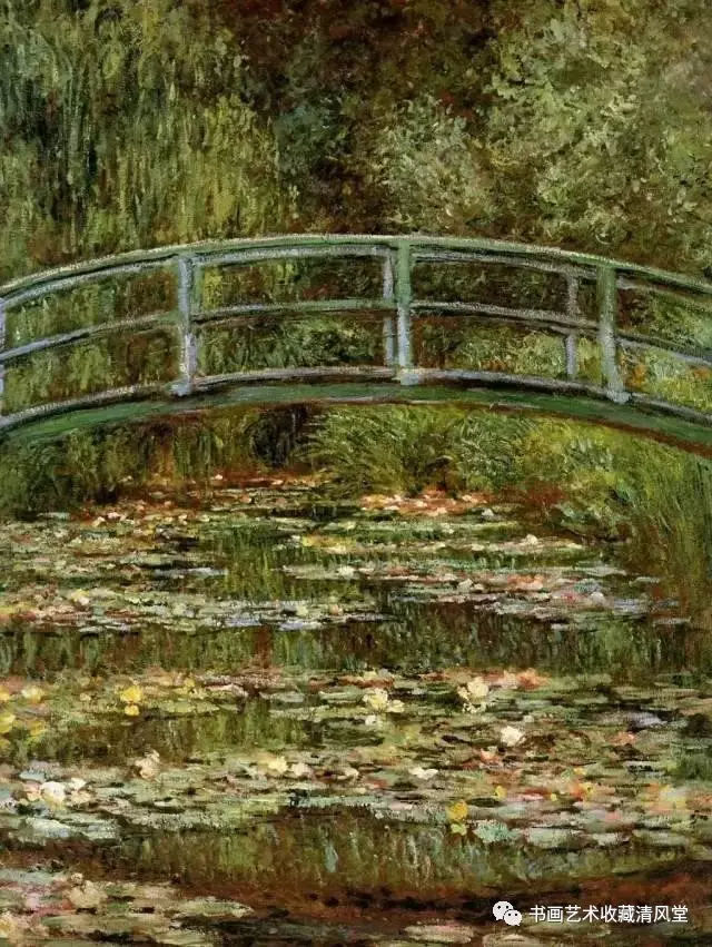 一座漆成绿色的日本式的拱形木桥跨越池塘;水菖蒲、百子莲、杜鹃花科的观赏植物和绣球花环绕并保护着池塘。 水面上漂浮着粉红色的睡莲。柳树和紫藤直泻水面,使水的色调变得更深、更蓝。直到1895年,莫奈才画了第一张池塘和日本桥的画。从1898年起,他又画了些同一题材不同版本的方形的画,其中十来幅曾在杜朗-卢埃尔画廊举办的他的新作展中展出。