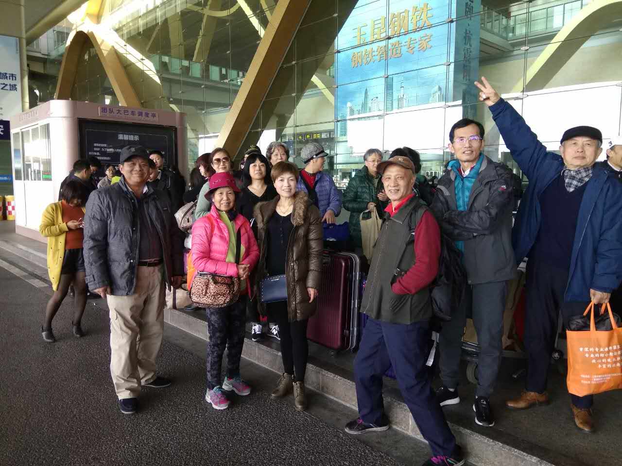 大家快乐的在机场大厅门口等待来接我们的云南国际旅行社的大巴。