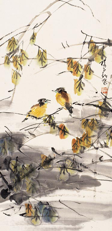 从90年代中期开始,杨正新的水墨画又有了新的变化。同样是花鸟、山水,杨正新的花鸟、山水作品除了有笔有墨,有文人情趣、自然气息,它们还具有一种迥异于以往的新气象。例如他的花鸟画创作上,很多墨笔看上去生涩纤弱有点神经质,但墨迹、墨块却显得淋漓酣畅,充满流动、氤氲之气,两相结合,令其画气质清丽,充满风致。而他画面的色彩与构图和传统海派写意画相比也有所不同,色彩与色彩、色彩与墨之间往往呈鲜明的对比关系,墨、彩辉映显得非常响亮,很有现代感。构图方面,他似乎对表现具体物象的形态并不十分感兴趣,他更注重于点、线、面在画中的平衡与趣味性,更着意于形式的表现了。