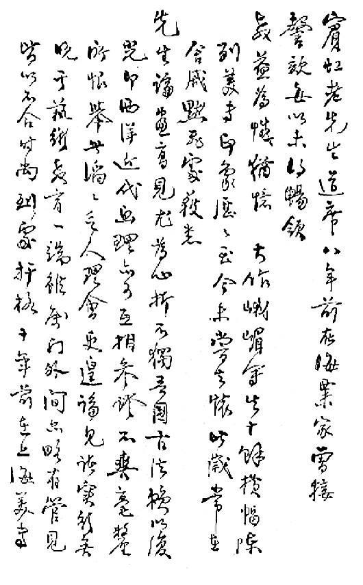 目前汪己文先生转来法绘,拜谢之余极佩先生笔法墨韵,不独深得宾翁神髓,亦且上追宋元明末诸贤,风格超迈,求诸当世实不多觏。吾国优秀艺术传统承继有人,大可为民族前途庆幸。惟大作近景用笔倘能为紧凑简化,则既与远景对比更为显著,全幅气象亦可更为浑成。溥心畬先生平生专学北宗,刻划过甚姑勿论,用笔往往太碎,致有松率之弊。不知先生亦有同感否?