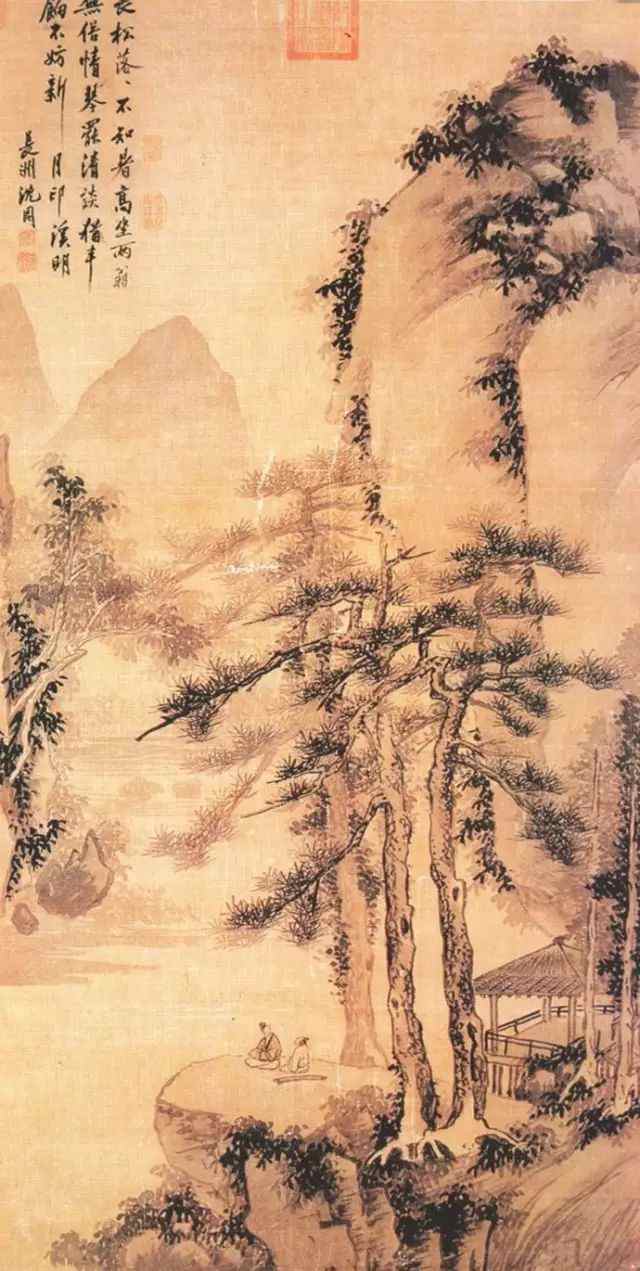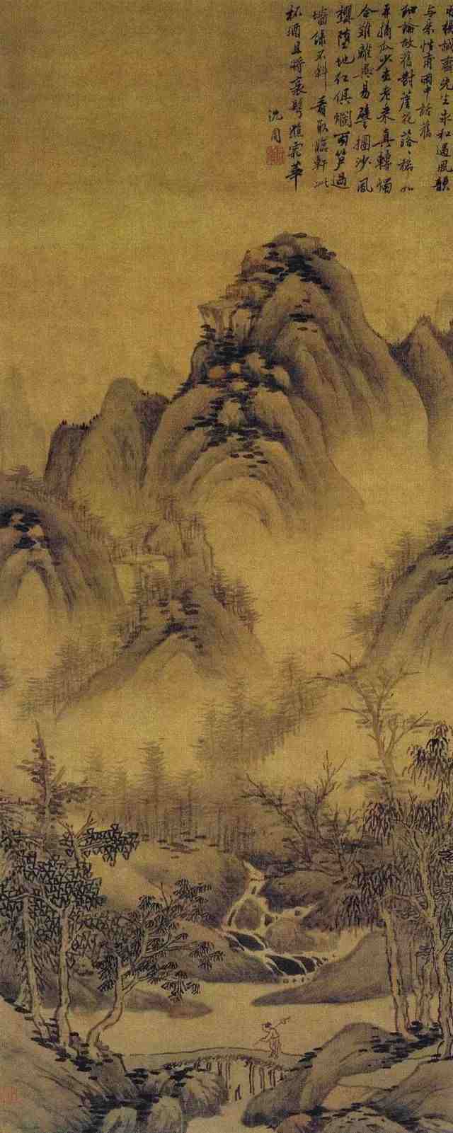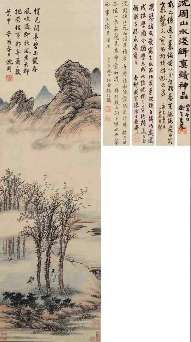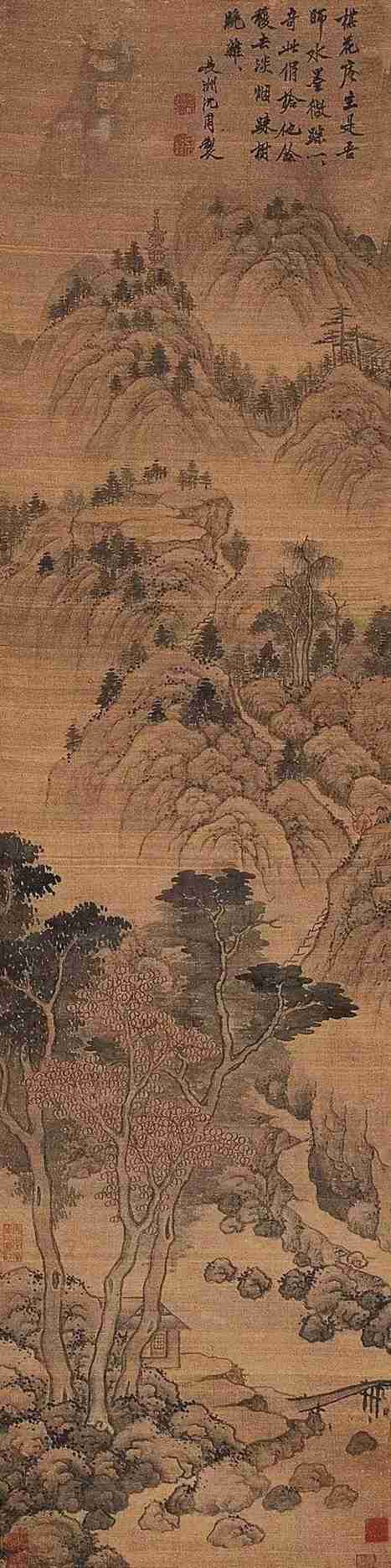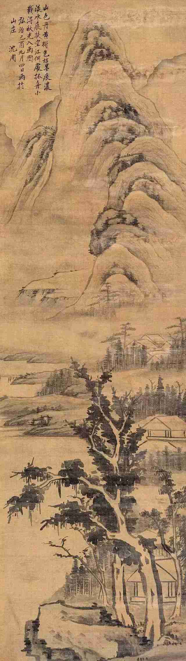 沈周早年多画小画,40岁以后才画大幅绘画作品,中年画法严谨,用笔沉着,晚年笔墨豪放,气势雄强。 沈周的绘画,技艺全面,在学习前人的基础上有自己的创造。