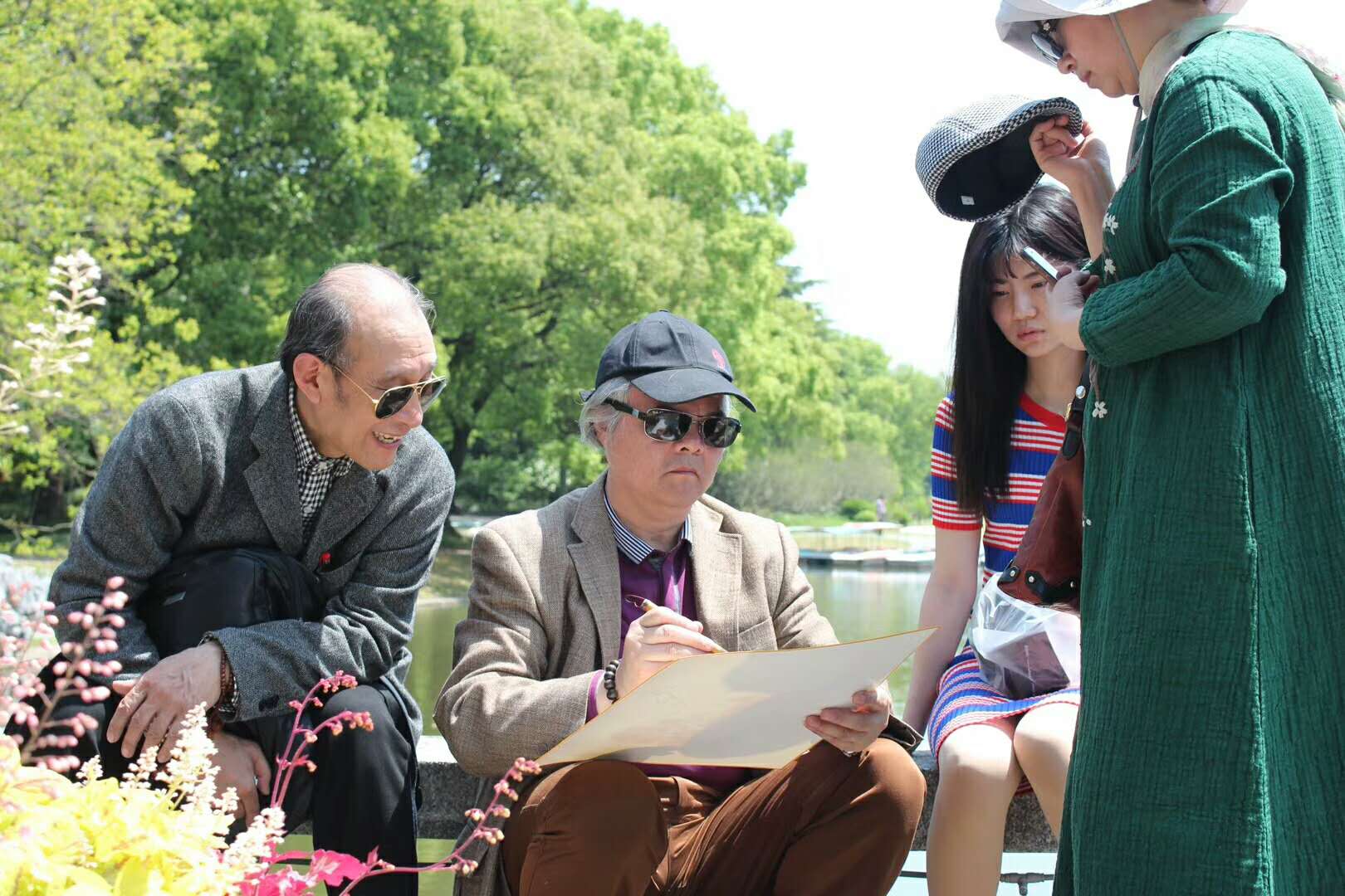 在植物园室内创作现场,陈琪老师、吴鸿副园长和陈世中老师合影