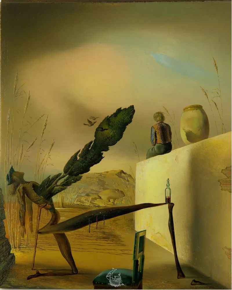 这幅早期作品中咧嘴笑的年轻人,真的有可能是我们完美无缺的艺术家本人吗?盒中的玩偶出现这一次之后,就被合上,而且永远结结实实地关起来了吗?如果真是这样,倒是可以解释描绘名声的画家强迫症式的性格,他几乎是蜷在画架上,像个大蟑螂。萨尔瓦多·达利对此特别激动,他多次把维米尔放在自己的弗洛伊德式混合作品中,次数几乎赶得上他模仿米勒的《晚钟》的数量。