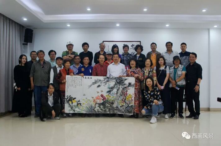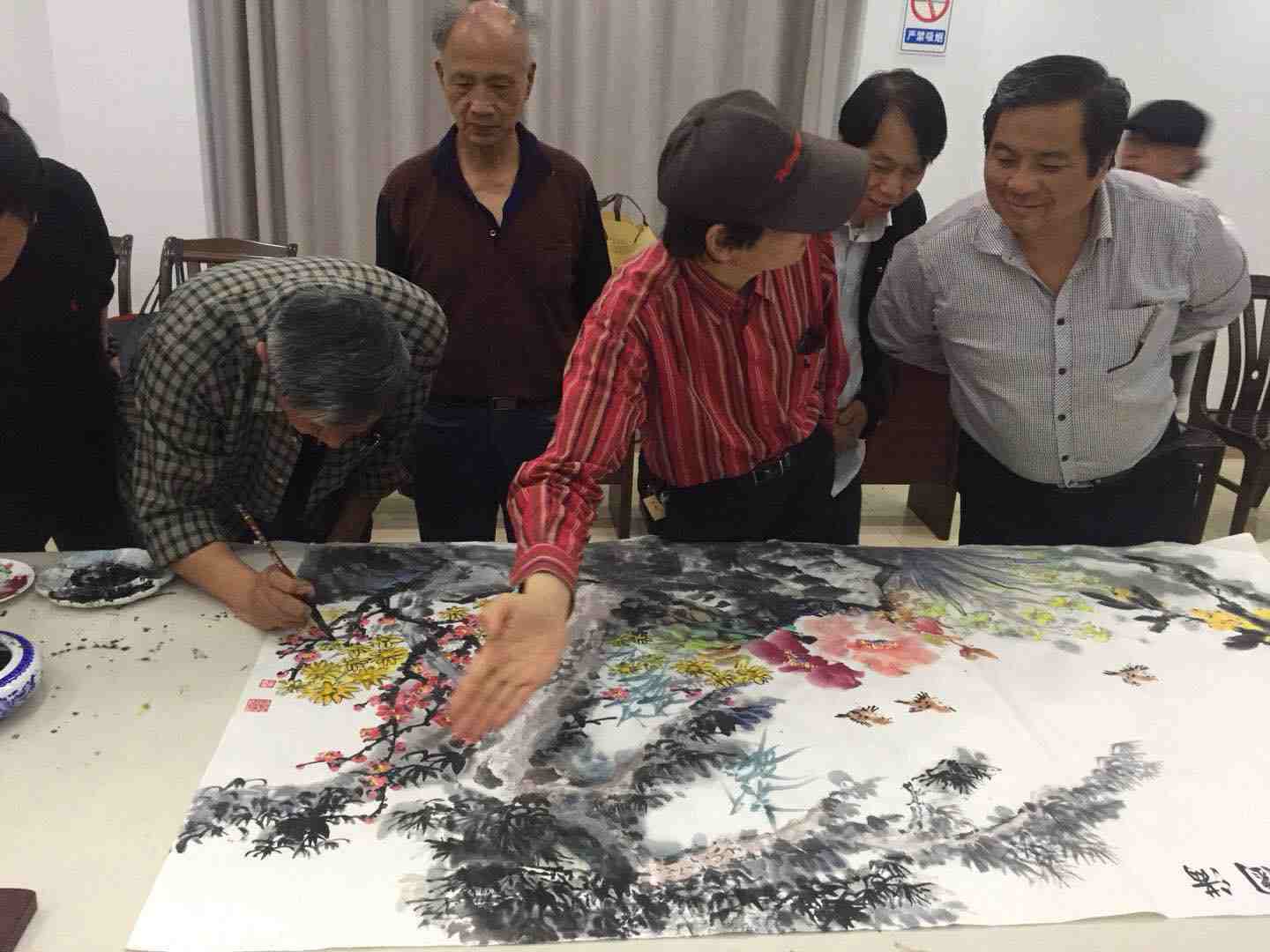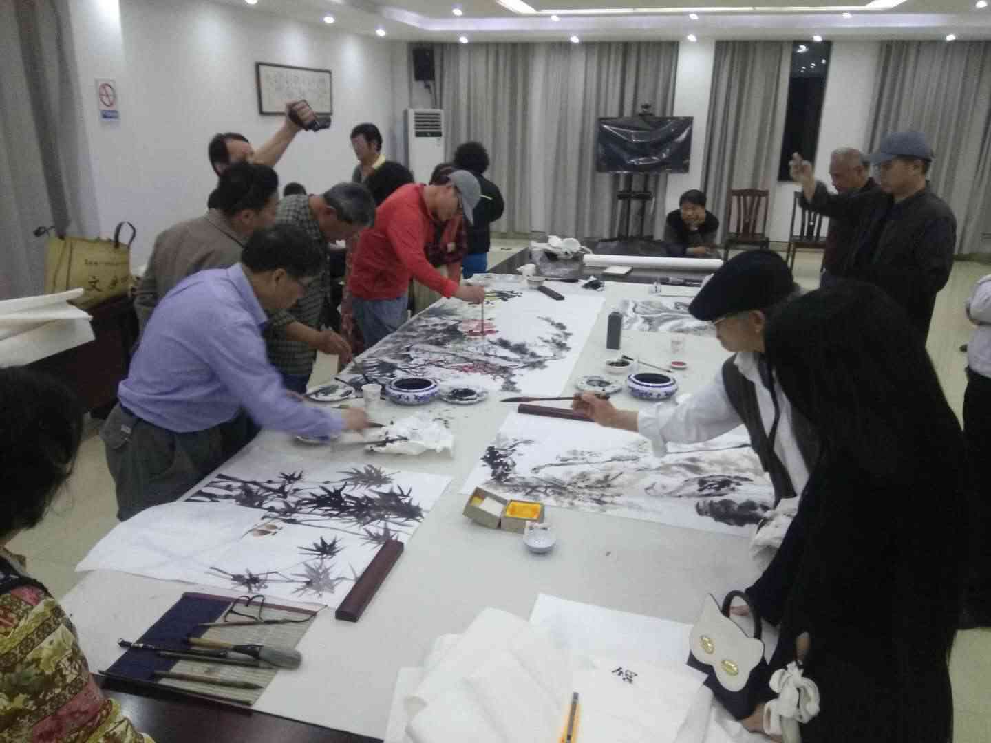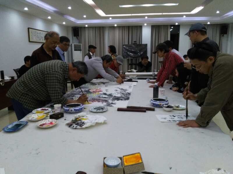 29日晚上,镇政府宴请了上海的艺术家们,在武国强老师的要求下,史新民老师提前做好了集体创作一幅大画的构图和准备工作,根据每个画家的特长,预先做了安排,在创作的时候以史新民老师主笔,武国强老师现场指导。