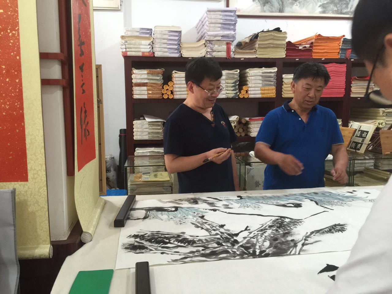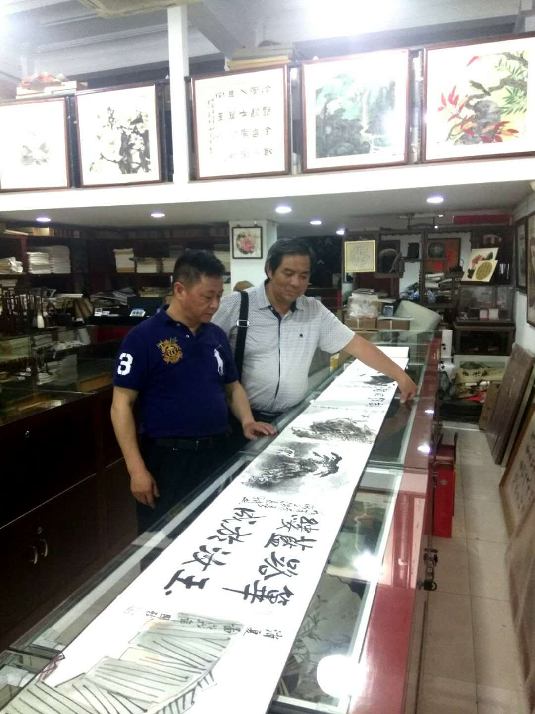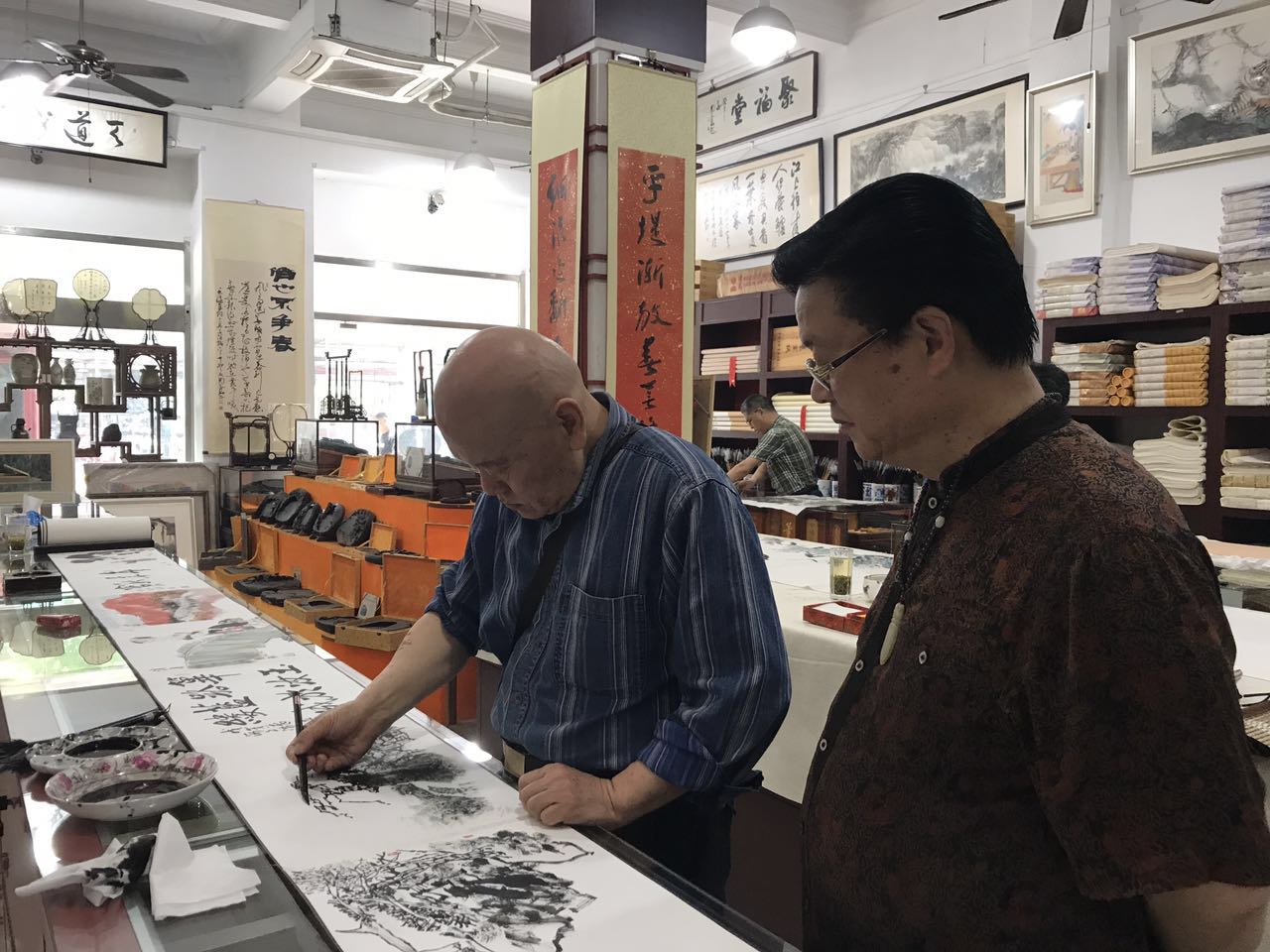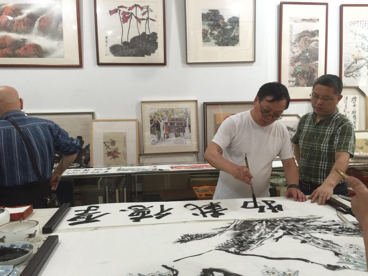 夏建峰和肖新林总经理在欣赏安徽画家刚刚创作的作品。