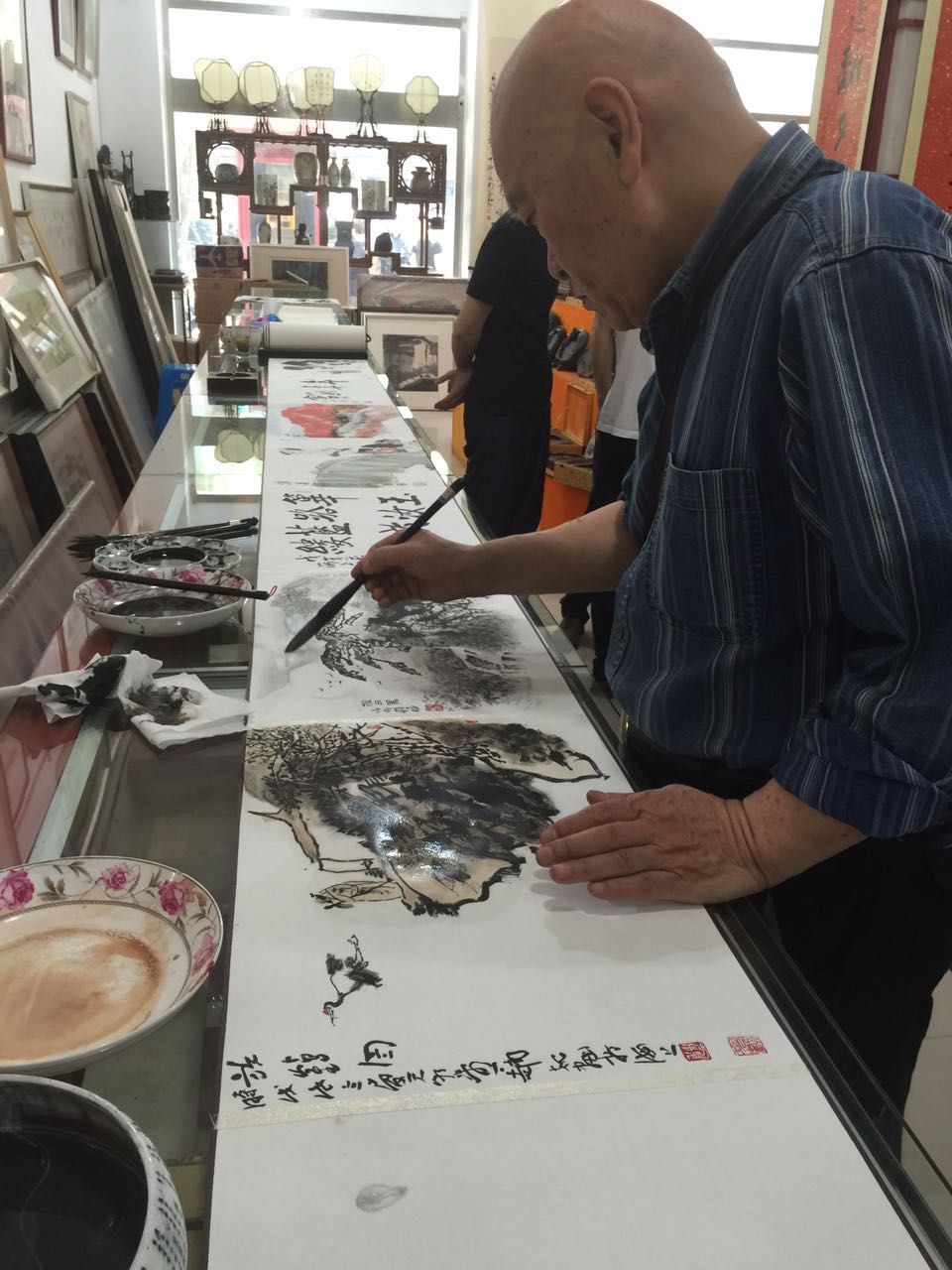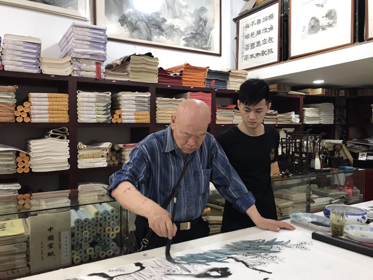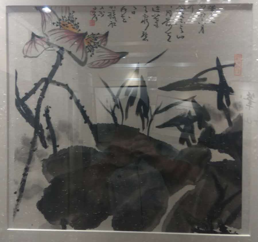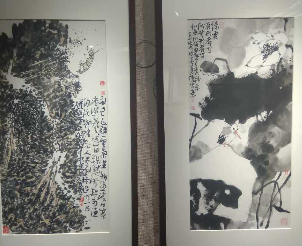 夏建峰和肖新林总经理在欣赏安徽画家刚刚创作的作品。