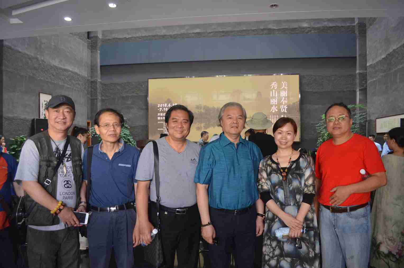 上海美协副主席兼秘书长陈琪先生和浙江美协副主席兼秘书长骆献跃先生,丽水在水一方写生基地总经理徐萍女士和上海美协武国强为首的创作沙龙全体人员、上海奉贤美协主席李钟、副主席兼秘书长洪樑为首的参展画家一起合影。