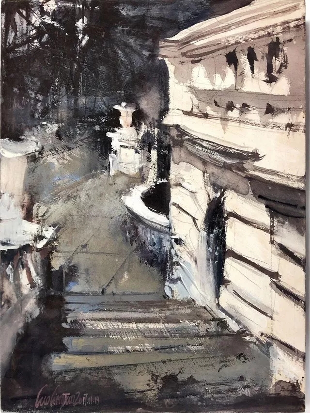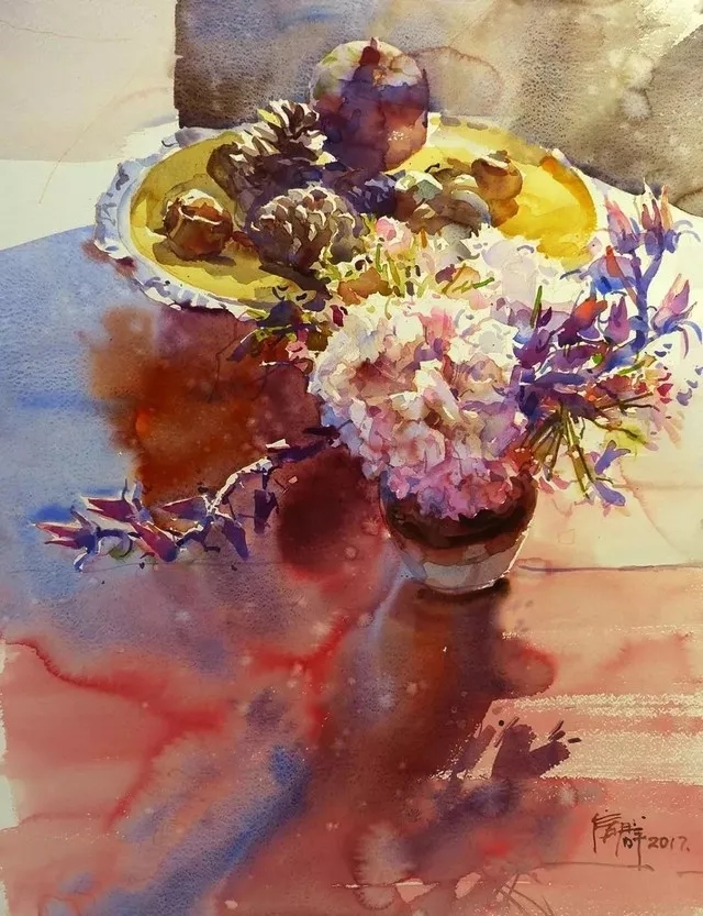 水彩,顾名思义,是水与色彩的邂逅、调和、交感。在水和颜料的作用下,物象怎样在层次、体块、光感等方面得到恰如其分的表达,既是对每个画家用水技巧的考验,也是对创作主体在对客体进行主观取舍、加工、变形、熔合时更高自由度的允诺。