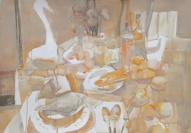 水彩和写生相伴相生。此次展出的作品涵盖不同题材,涉及自然风景、城市景观、人物、静物、建筑……我们看到不同类型的题材,既有自然层面的,也有人文层面的,以水彩交蕴、光影绰绰的方式出现在观众面前,它们诞生在创作者对时空体验、素材细节进行必要的整合和创新之后。用水彩的方式处理题材时,可以具象,可以抽象,或在具象非具象之间。有的作品以大胆、跳跃的用色满足了现代的视觉模式,有的则超脱客体形象的有限束缚,在色彩肆无忌惮的挥霍中架构了画家的情绪空间。在这些作品前流连,不觉令人想起吴大羽所言:“余亦存余梦,飞光嚼彩韵。”