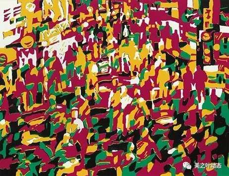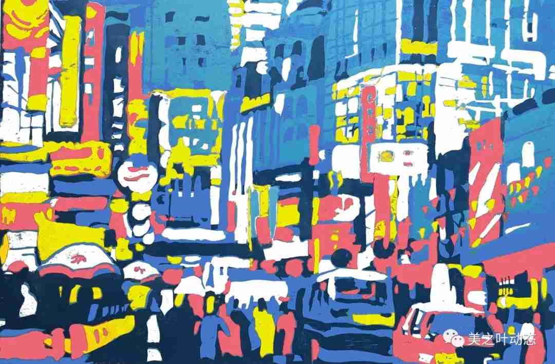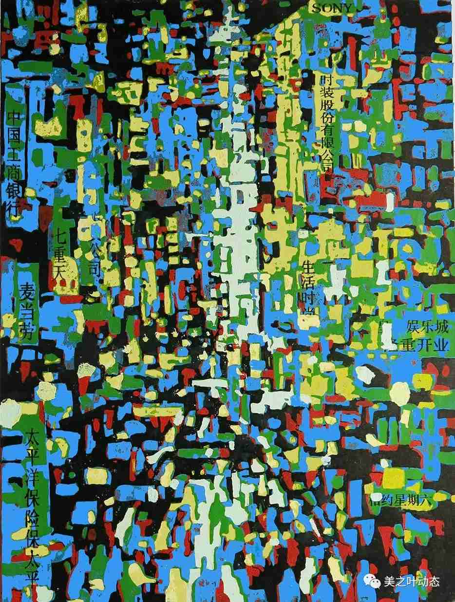 国强的版画作品,所选的题材除了少量的花卉之外,大部分为城市的生活场景。浦江两岸的高楼、喧嚣繁华的街道、熙熙攘攘的人群都是他钟爱的题材。国强的套色木刻,用色对比强烈而饱满,大胆甚至夸张。在刻制时运刀朴拙平实,少见精细而花哨的刀法。而这看似简朴的处理手法,恰恰为大块的色彩表现留足了余地和空间。参差交错,对比强烈的明丽色块,把魔都充满动感,令人眼花缭乱的气氛表现的淋漓尽致。