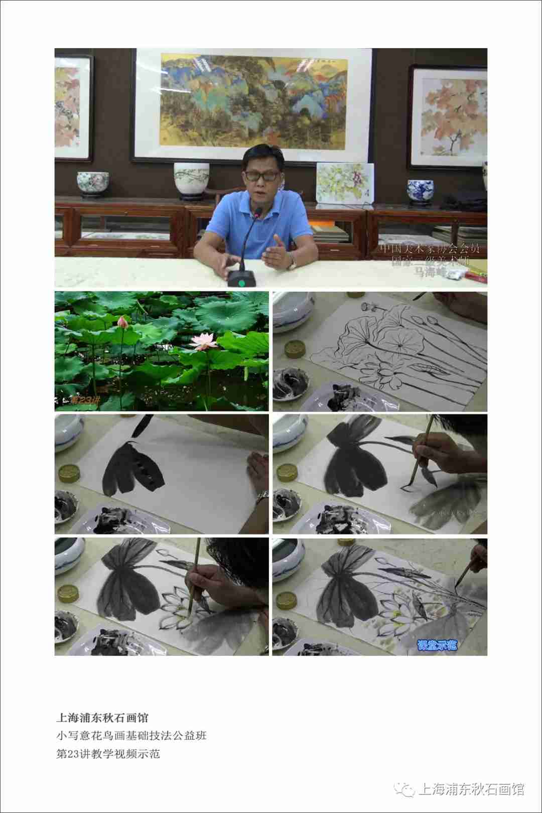 天空飘着细雨,八方学员陆续赶来。时隔二月,桃李春风、弦歌一堂、以画说画、其乐融融。新版第二十三讲《墨荷》教学视频耳目一新,对荷花生长结构和四季规律不仅增添实景照片,而且摄录了马老师对荷塘各个“零部件”的手绘解读和完整稿示范。