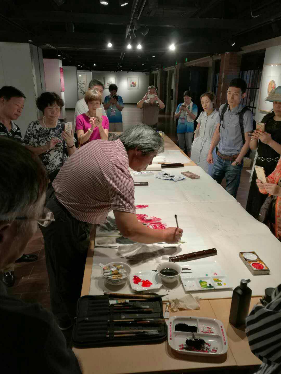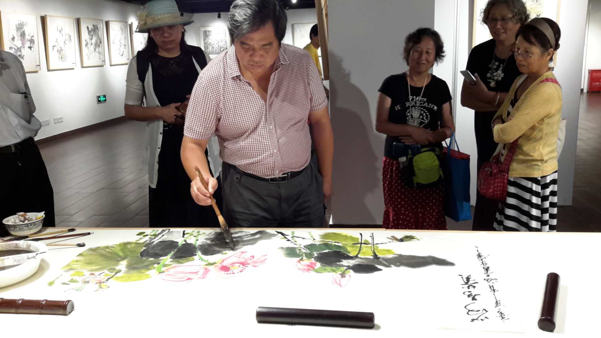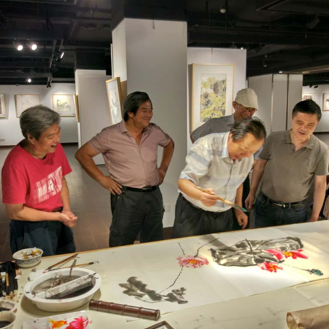 前来参加交流活动的还有虹口区美协主席余仁杰、青浦区美协副主席陈大健、非遗传人英自海、水彩画家胡海南、翟兰平、胡爱伦、谢震贤、邵文海、摄影家胡亚男,以及书画爱好者一起参加了笔会和艺术交流。 著名画家杨正新老师正在创作四尺整张荷花图,右起余仁杰、孙忠民、夏建峰和陈大健 画家夏建峰老师首先开笔,创作四尺整张荷花图。 书法家孙忠民老师 艺术网记者石波报道 上一条:《花鸟画沙龙年展》纪念改革开放四十周年《春华秋实》——2018上海市美术家协会中国画花鸟画艺术沙龙年展【中国美术家书法家艺术网】快讯 下一条:【中国美术家书法家艺术网】讯,“上海美协花鸟画沙龙年度展”昨天下午三点钟在上海海派文化中心隆重开幕