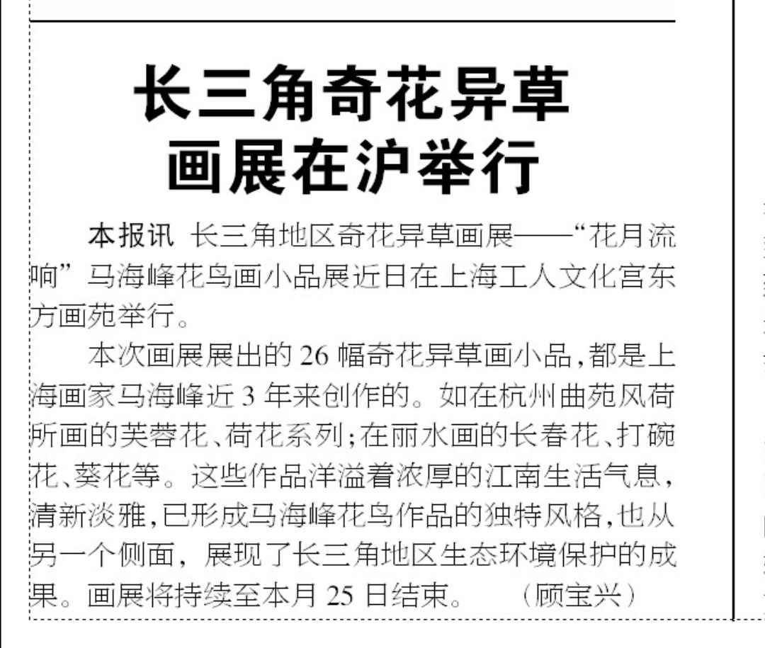 作品《秋韵》、《塞外寒云》分别被浙江美术馆、中国革命军事博物馆收藏。2005年上海画报社出版《上海美术家画库-马海峰卷》。2015年上海人民美术出版社出版《山石花草共一色-马海峰山水花鸟课稿集》三册。