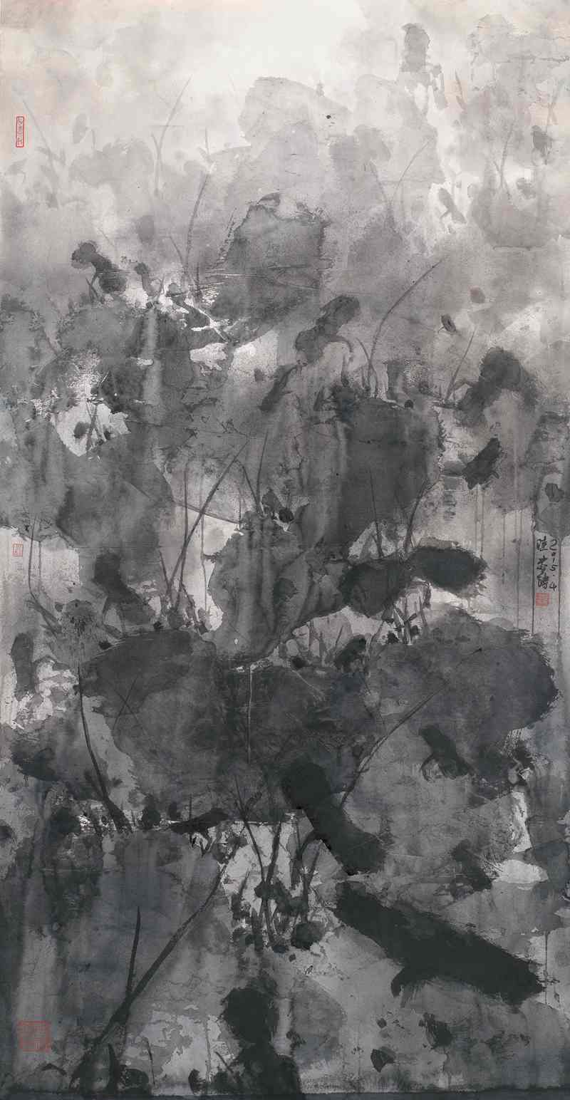 本次展览呈现于上海中国画院美术馆一楼、二楼展厅,近60幅水墨精品或斑驳重彩、或水墨淋漓,将传统的“荷塘”母题演绎出更为宽泛和多义的内涵。陆春涛在出色的传统水墨功底基础上,不落前人笔墨与图式的窠臼,完美地将东西方美学与视觉审美融会贯通。从笔墨语言和形式构成上看,他的水墨近似乎抽象,甚至会让人联想到西方的“抽象艺术”“表现性艺术”,这在很大程度上消解了传统中国画的笔墨程式。同时,其水墨性表达又很好地继承了“东方式水墨精神”的衣钵,与水墨文化传统中“心观万象”的智慧更加息息相通。尤为可贵的是,陆春涛在完成艺术语言的自然转换和绘画形态的现代嬗变的同时,还成功地实现了传统水墨精神与现代社会中人的精神诉求合二为一的境界。