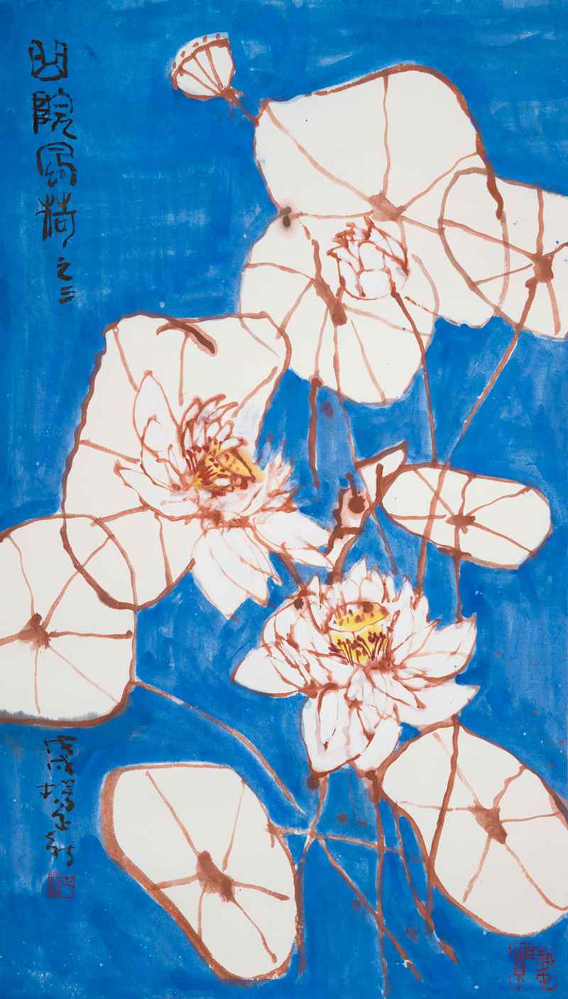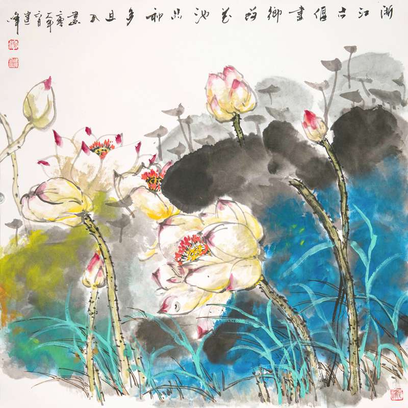 进入改革开放新时代,海派花鸟画家人才辈出。这次在海派文化中心展出荷花作品的画家,是当代海派画家中的代表人物——陈家泠、杨正新、陈琪,他们个个都是以荷入画的高手。在他们画中,既有传统国画的线条与墨韵,也有印象派、抽象派理念和风格的渲染与浸润,这些正好体现了海派画家百年来文化互相激荡中,渐渐形成的融会贯通、包容并蓄的风格。