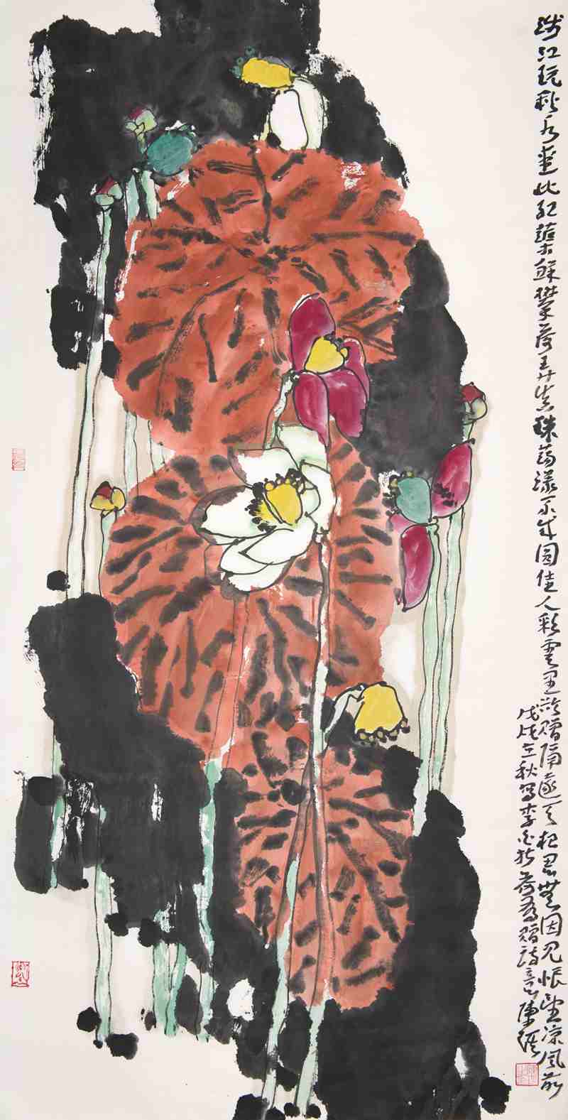 荷花是历代画家最钟爱的抒发情感的创作题材,画家喜爱她“中通外直、不蔓不枝、香远益清、亭亭净植”的形态特质和生命意蕴,喜爱她的“出淤泥而不染、濯清涟而不妖、可远观而不可近玩”的圣洁高贵清逸的品格。元明两代便有以画荷出名的画家如王冕、周之冕、陈洪绶等。清代以降,任伯年、吴昌硕、傅濡、齐白石、张大千等将荷画推至新的高峰。近百年来,海派画家异军突起,黄宾虹、潘天寿、李苦禅、江寒汀、吴湖帆、朱屺瞻、谢稚柳、张大壮、唐云、程十发等,他们留下许多艺术性极高的荷花作品。