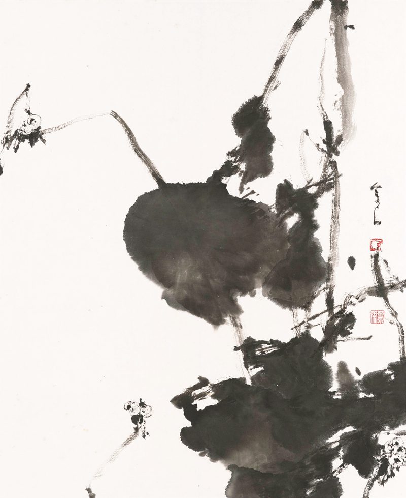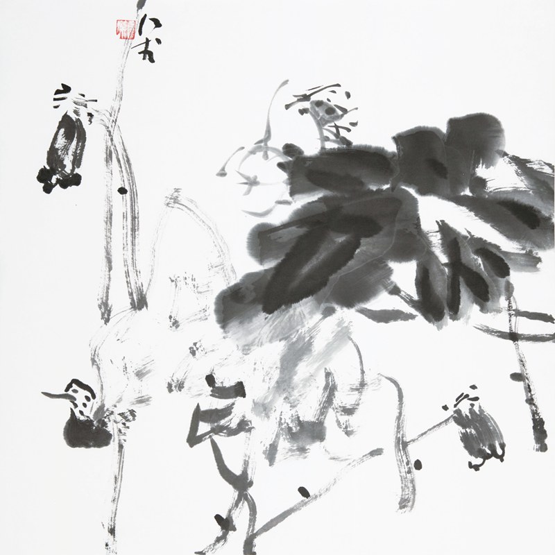 陈家泠早年毕业于浙江美院,师承潘天寿和陆俨少,他拓展了画面构成说,讲究用笔的滞守和渗透,讲究纸质与笔墨的融合,形成了自己独特的荷画风格,独步沪上。这此展出的荷花新作,是他对构成画说的新发展、新探索。应上海市美协的邀请,2018 年盛夏的一个上午,于鲁迅公园荷花池旁,烈日之下,几十位上海市美协成员和花鸟画艺术沙龙的画家,簇拥在陈家泠先生的周围,观摩陈先生的荷花写生,聆听讲解。而后大家移步至海派文化中心,先生为满室同仁讲解荷花写生和创作的不同特点和要领,介绍了自己荷画的创作体会,并当场创作荷花图一幅,以飨观者。此举足见先生的风范。