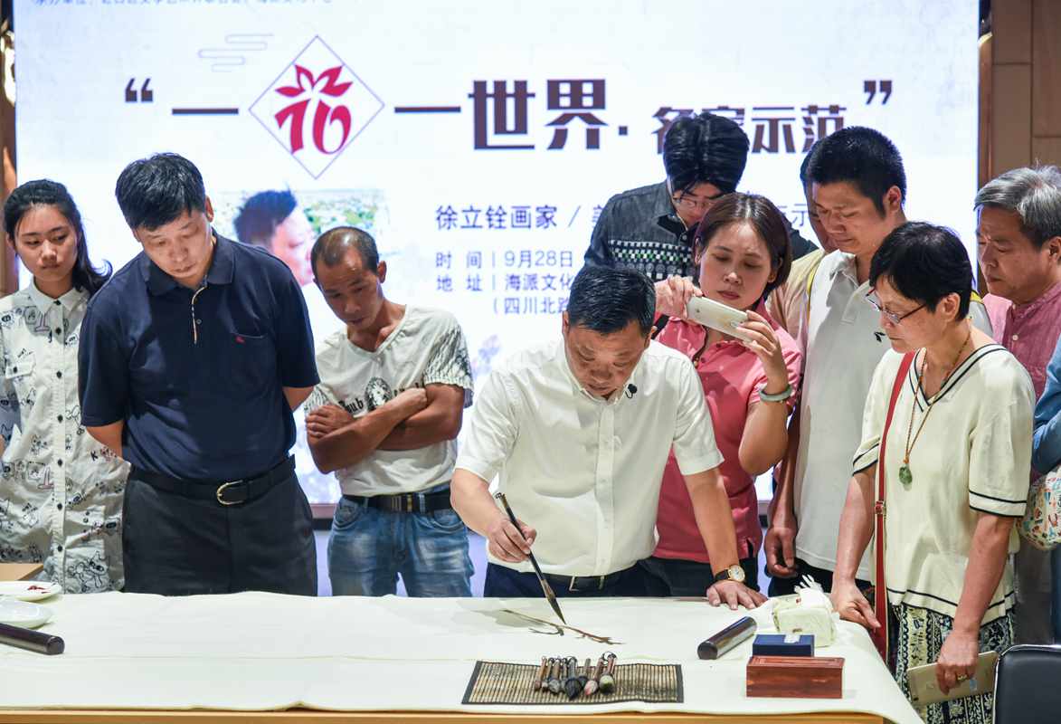 在上海市文学艺术界联合会指导,上海市文联媒体中心联合上海市美术家协会共同推出“一花一世界·名家示范”活动,第六期有著名画家徐立铨美人蕉写生示范活动与2018.9.28.上午九点在上海海派文化中心举行,这次活动有虹口区文联和上海海派文化中心承办,上午八点半已经有许多艺术爱好者早早地来到海派文化中心广场写生现场,电视直播的工作人员也早早地来到现场调试摄像机。