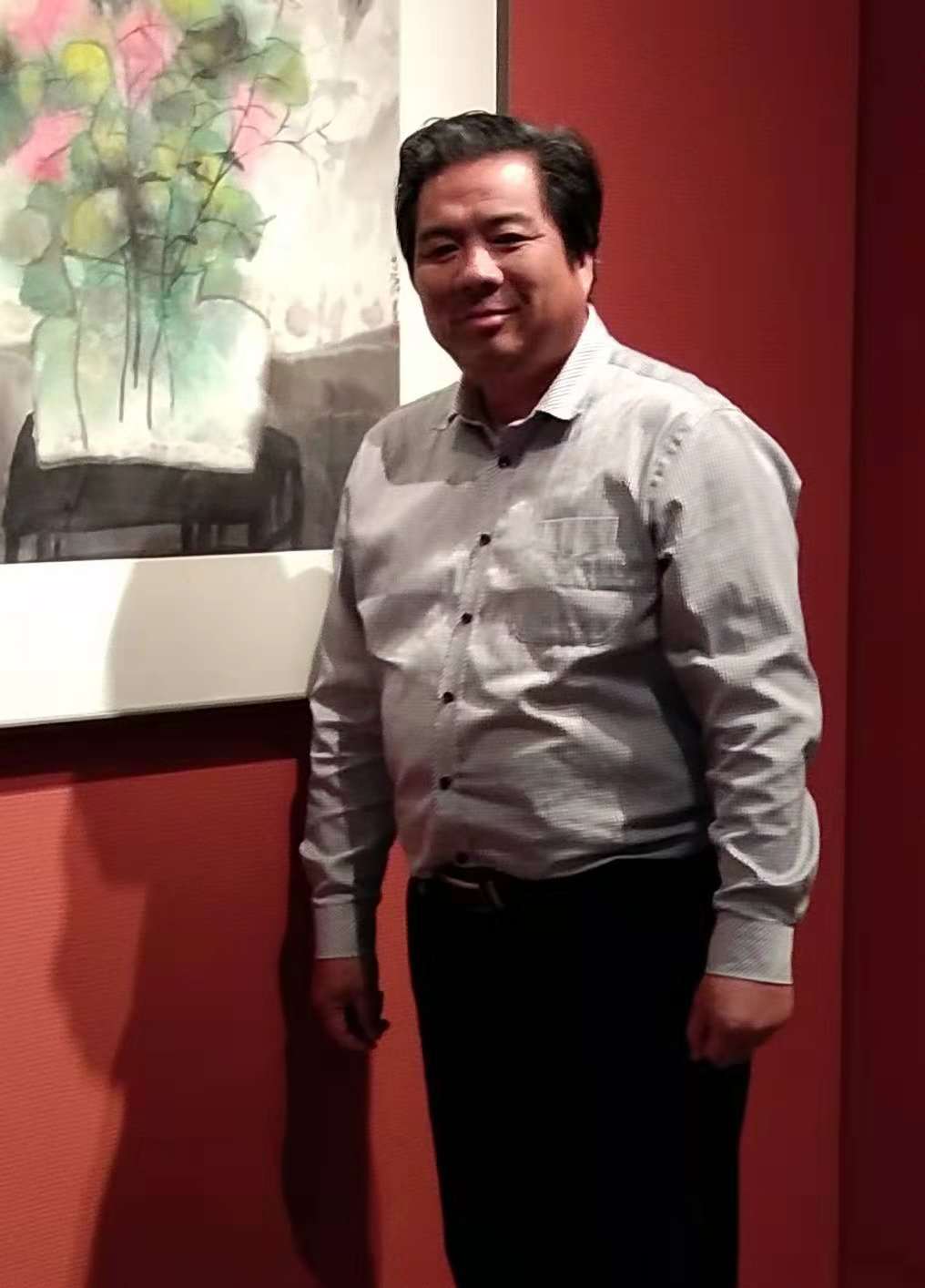 我和陆春涛是大学同学加好友,陆春涛作品观摩展亮相上海中国画院已经有一个多星期了,由于上个月的九月二十九日参加崇明新海建镇十周年庆典,没有第一时间过来,心里就好像缺了一些什么,今天上午刚刚从农工党上海市委秘书长办公室那里出来,就急急忙忙的来到位于岳阳路的中国画院,走进画院的美术馆,整个色调就是一个艺术殿堂,墙是铁锈红色的,迎面看到第一幅作品“舒卷任天真”画的是瓶花,整个画面给人一种舒心安详的感觉,用笔松松的,色彩淡雅的,线和面的结合和块面的对比又是那么的自然,显示了春涛早年的中国画传统功底。