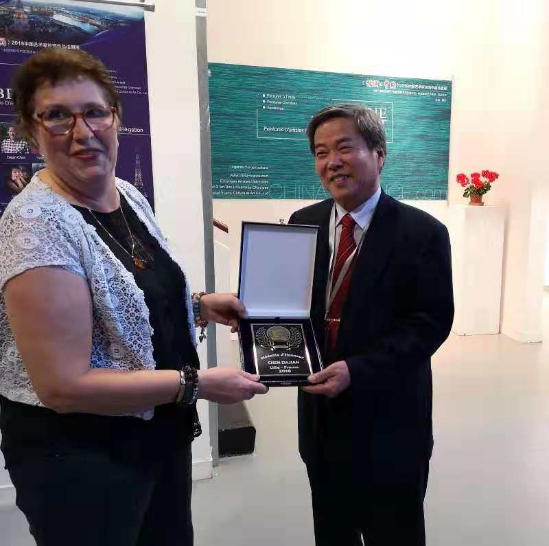 10月23日下午6点,大健作为中国9位杰出艺术家应邀赴法出席了在法国里尔北加莱公立高等美术学院举行的“灿烂.中国”2018中国艺术家绘画作品法国展开幕式”并被颁发了2018年“法兰西共和国荣誉勋章”和“荣誉证书”。