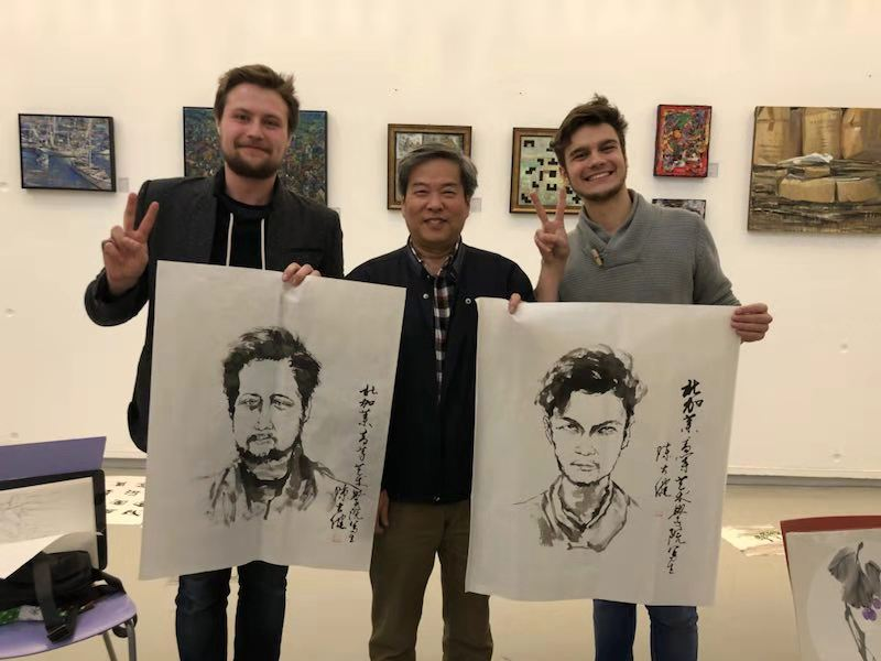 陈大健先生为北加莱国立高等美术学院二位研究生现场水墨人物写生