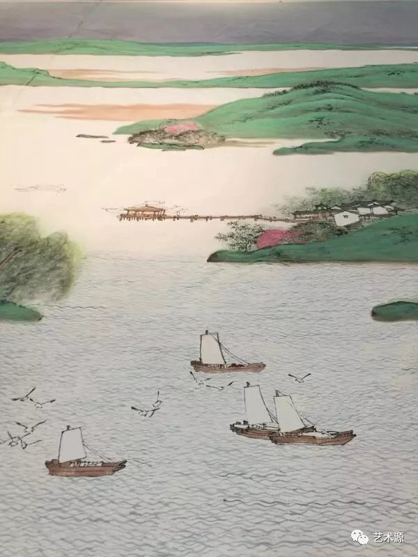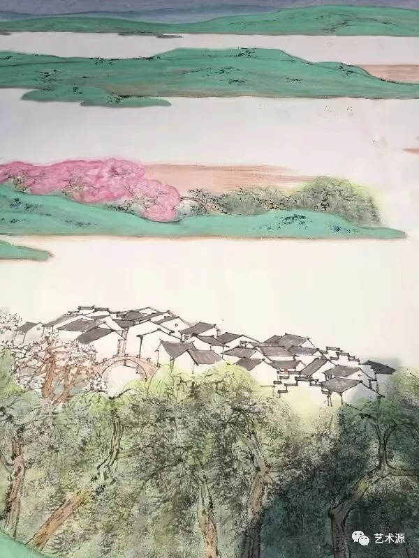 江南的春天当然离不开水的表现,水是画面中心,也是连接山与水,人与自然的纽带,创作团队在水的处理方法上用勾线的方法,与平远的山势相呼应,然后层层擦染,表现出水的淸灵让人身临其景,有"日出江花红胜火,春来江水绿如兰"之感。