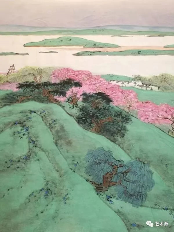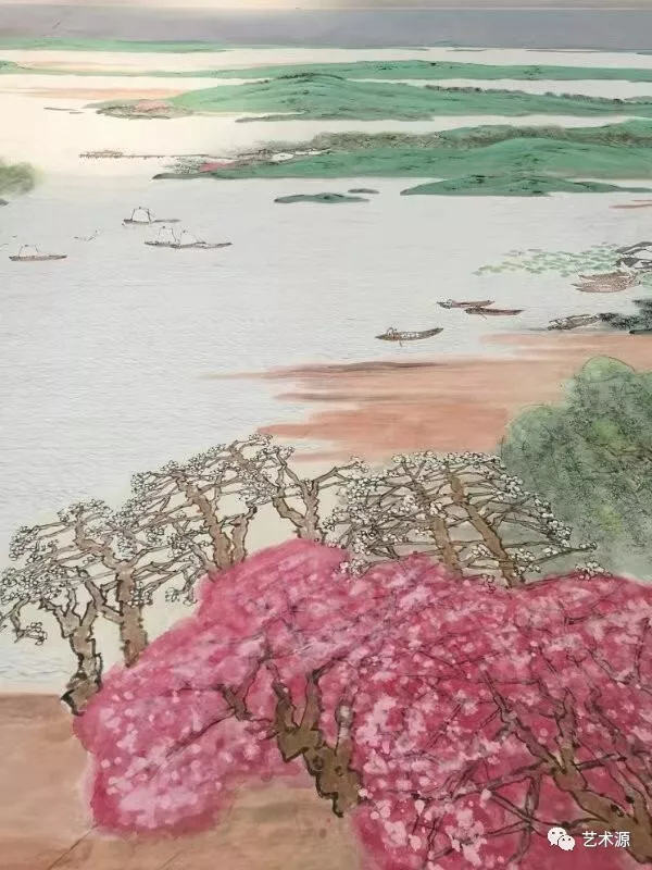 一目千里的旷观,能够把握江南自然的内部节奏。画家们临空从四面八方抽取那花满蹊、风满楼的江南婀娜姿态,融汇于钱塘江、太湖与京杭大运河的丰沛气势——近处岸花临水,有绯红桃花,月白玉兰,初春莲叶,摇曳柳枝点缀着或润或细的墨线,花瓣晕出或浓或淡的色点;远处青山重重悉见,早霞曙光的色彩和桃花红色相呼应。