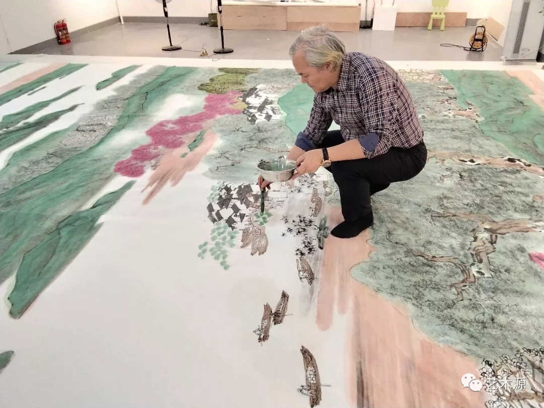 这次创作团队四人都对江南生活江南文化比较熟悉,陈琪是画人物花鸟为主,车鹏飞、江宏、汪家芳擅长山水,合作中各自发挥长处和智慧,相互配合,在较短的时间较好完成当代最大的一件青绿江南山水作品。