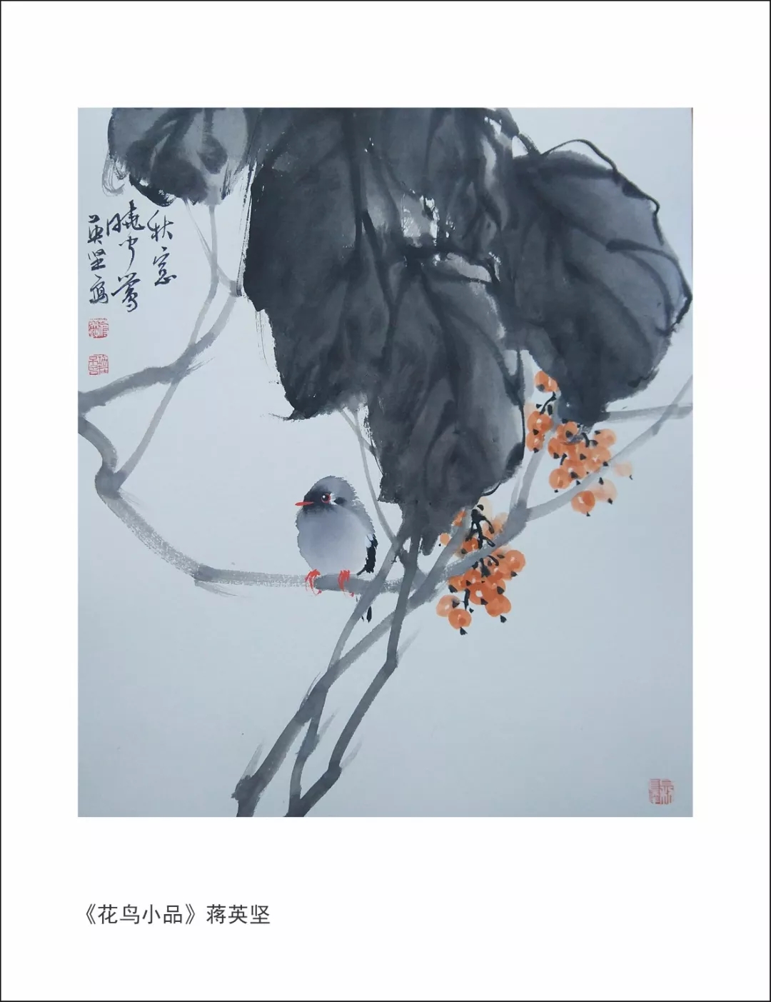 杨维桢说:“书与画一耳。”没有好的书法,就必然没有好的绘画。今日之中国画坛能书者不多,板、刻、结滞之病多多,更遑论笔墨、气韵了。多年来英坚将书法与绘画很好地结合起来,他的传统花鸟画有着超常的线条张力,线条里有形象有姿态有节奏,功底扎实。将他的写意花鸟画做个比较,前后的变化还是显而易见的,这是伴随着他对绘画的逐步认识,自觉地对物写生,扎根于研究传统花鸟画的笔墨技法而自然生成的。我看前些年他的花鸟绘画造型用笔精准,气息清新,生动优雅,而近年来,他的作品笔力遒劲中多了概括大气,多了神韵的传达,能感受到英坚致力于探求一种臻于自如的笔墨语言,寻求突破,寻求卓越的心胸气概。