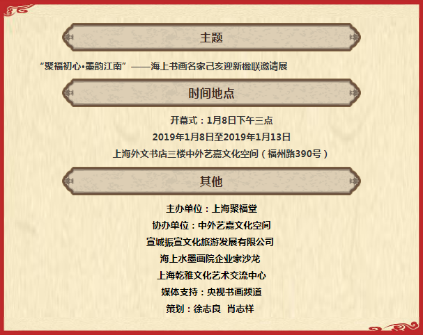 “聚福初心·墨韵江南”——海上书画名家己亥迎新楹联邀请展,即将于2019年元月8日下午三点半在上海福州路390号外文书店三楼中外艺嘉文化空间拉开帷幕,这是上海聚福堂每年一度的楹联邀请展。