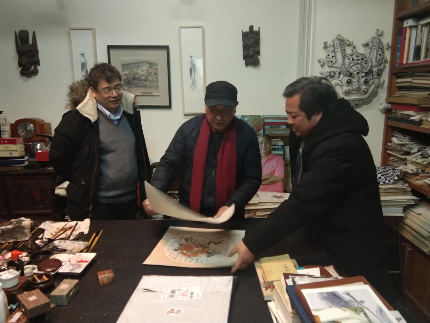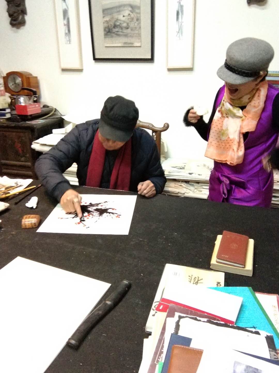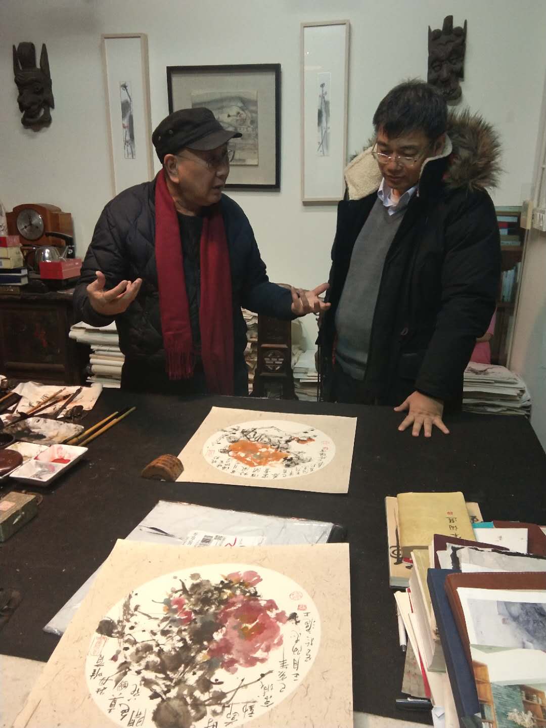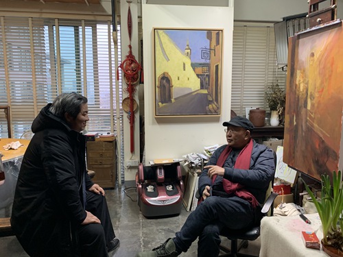 二月十四日下午,我和黄阿忠老师约好下午三点半去阿忠老师的画室,阿忠老师家已经高朋满座,到老师画室最开心的事,就是看老师的绘画作品,老师的油画和国画样样精通,散文和诗赋可以说是上海滩的全才,我来到画室自然就谈到绘画,他分析了我最近一段时间的写生和创作的作品,又毫不保留的示范和解说,让在场的人得益匪浅。