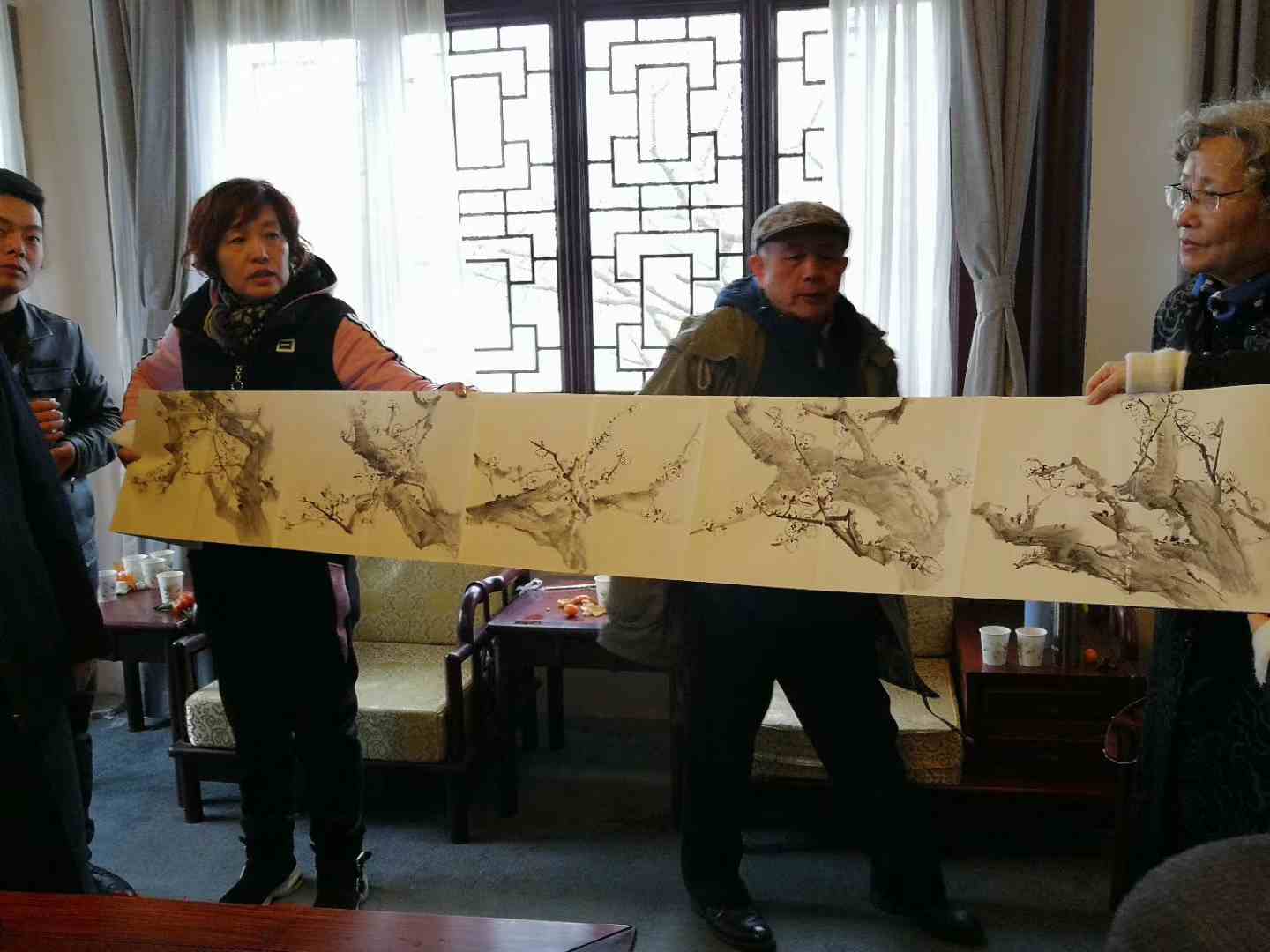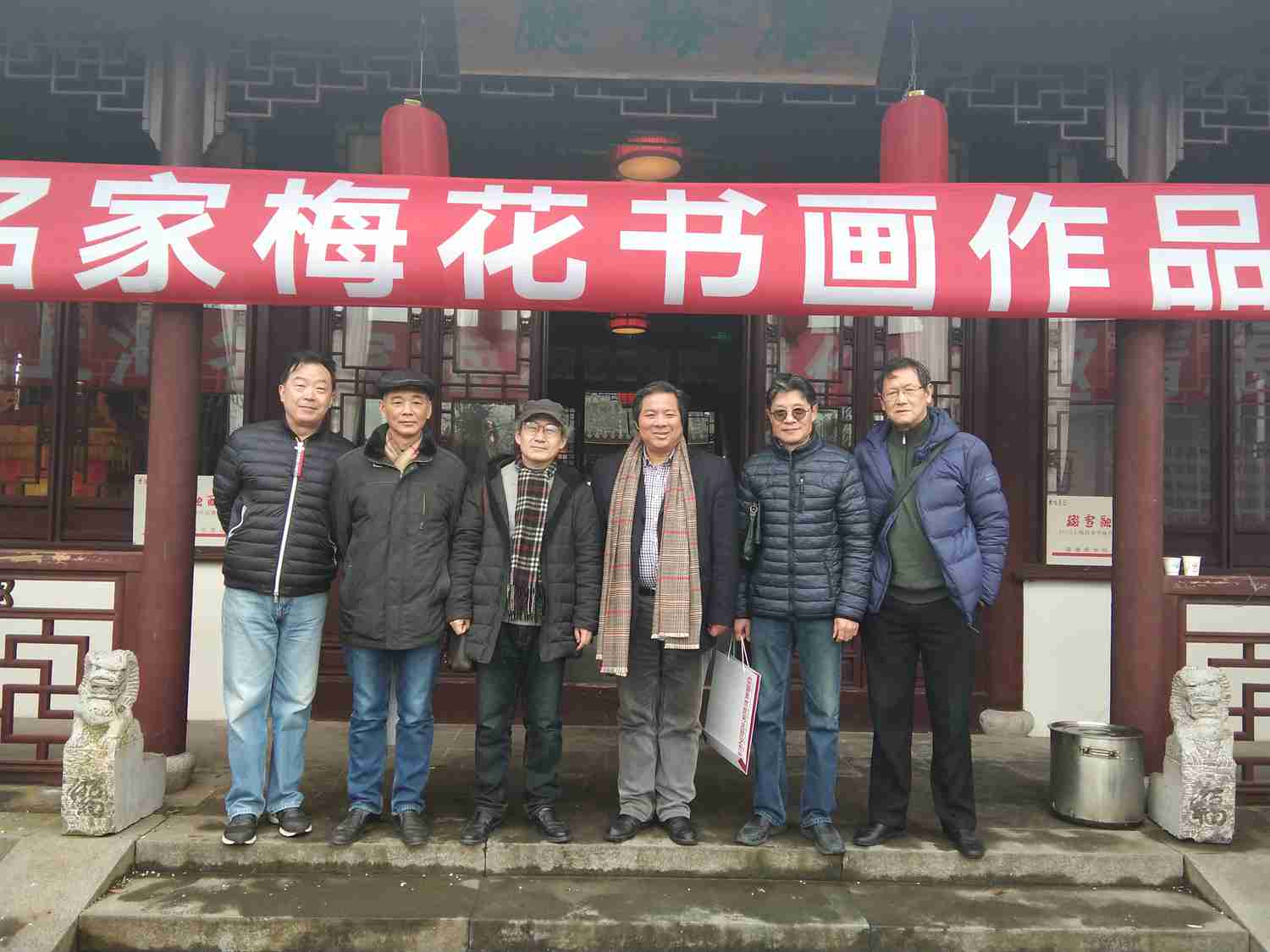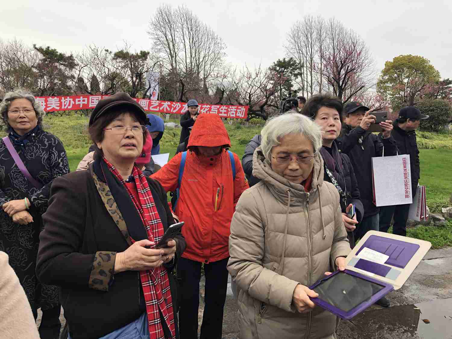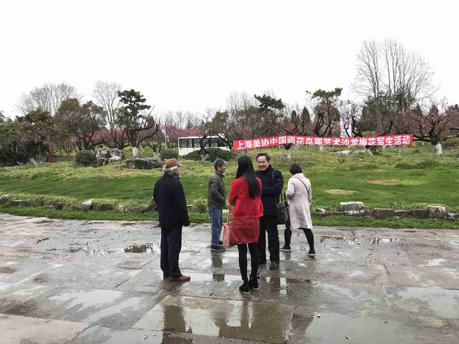 三月十四日早晨,天还下着雨,上午十点半,雨停了,上海名家梅花书画作品邀请展开幕式准点开幕。来自市区一百多位画家来到沙龙与虹口美协的创作基地奉贤海湾国家森林公园的唐梅厅画廊,一起参加开幕式活动。参加开幕式和写生活动的领导与贵宾有虹口区文联主席陆健,奉贤区文联主席瞿建国,著名画家杨正新,上海美协中国画院艺委会主任韩硕,上海市美协副主席陈琪,上海市书协副主席晁玉奎,上海市美协油画艺委会主任黄阿忠,上海市美协海墨画会会长应鹤光,上海市政协书画院副院长张培基,以及上海美协花鸟画艺术沙龙负责人余仁杰、夏建峰、余石等。这次活动总策划是夏建峰先生。首先由虹口区文联陆健主席祝开幕词,市书协副主席晁玉奎,市美协副主席陈琪,市美协油画艺委会主任黄阿忠分别讲话,最后由市美协中国画艺委会韩硕主任,宣布画展开幕。画家们与前来看展的市民在展厅中一同欣赏艺术与大自然相结合的美好。感受在艺术家的笔墨下呈现出的梅花的冷艳清绝的傲骨风姿。