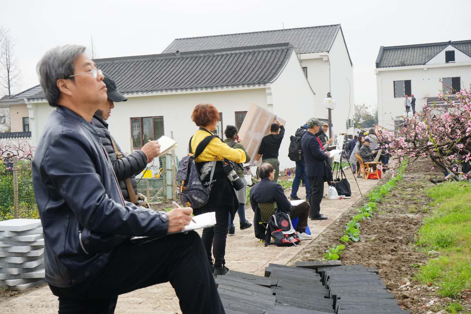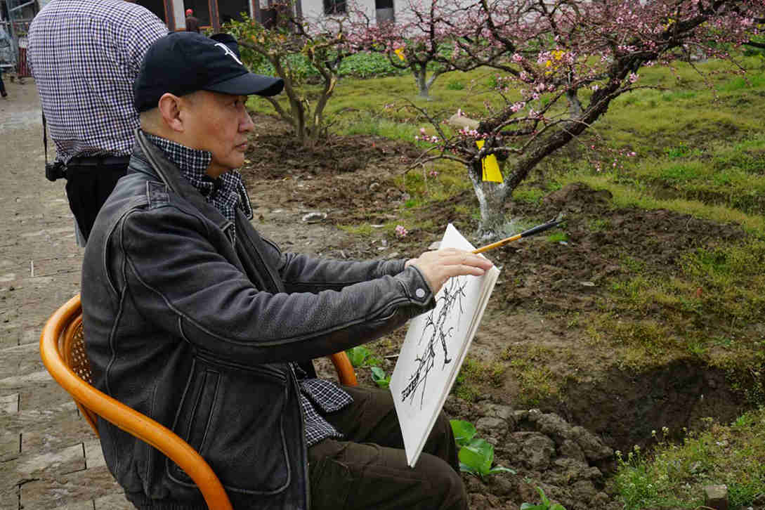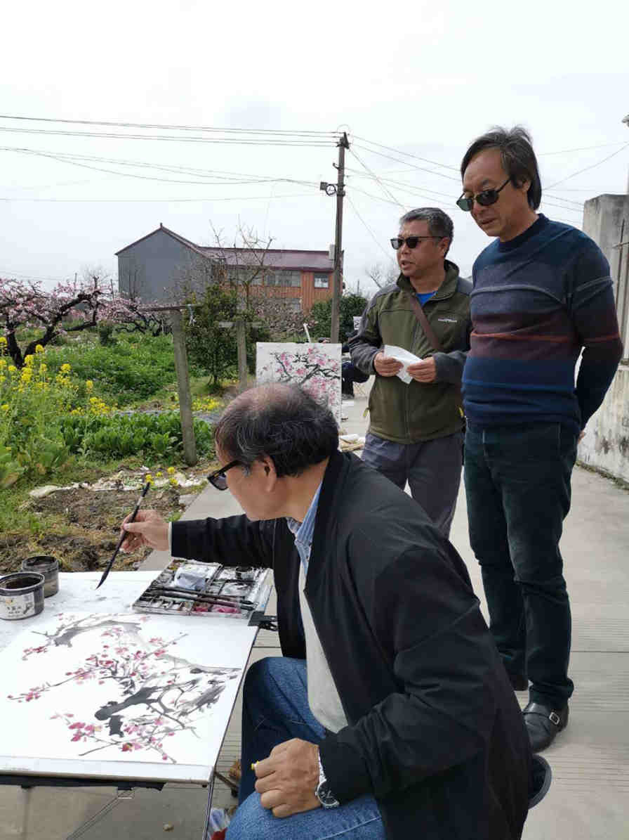 上海市美术家协会副主席陈琪老师27日冒雨就来到吴房村写生,看着桃花、看着吴房村的美丽乡村,两天时间画了20幅桃花主题作品,市美协海墨画会应鹤光会长,在宝山区美协副主席、海墨画会副会长王鹏老师的陪同下,28日一早赶来了,一下车,站的田边不走了,应老师说:这里的桃花非常的美,到处可以画,我就从这里画起。陈琪、应鹤光、王鹏他们三位老师在两天的时间里创作写生的许多作品,奉贤区青村镇的肖主任多次来看望和关心先期来写生的老师,奉贤区美协主席李钟、副主席乔晓燕27日一早也来到吴房村现场,看望陈琪老师。