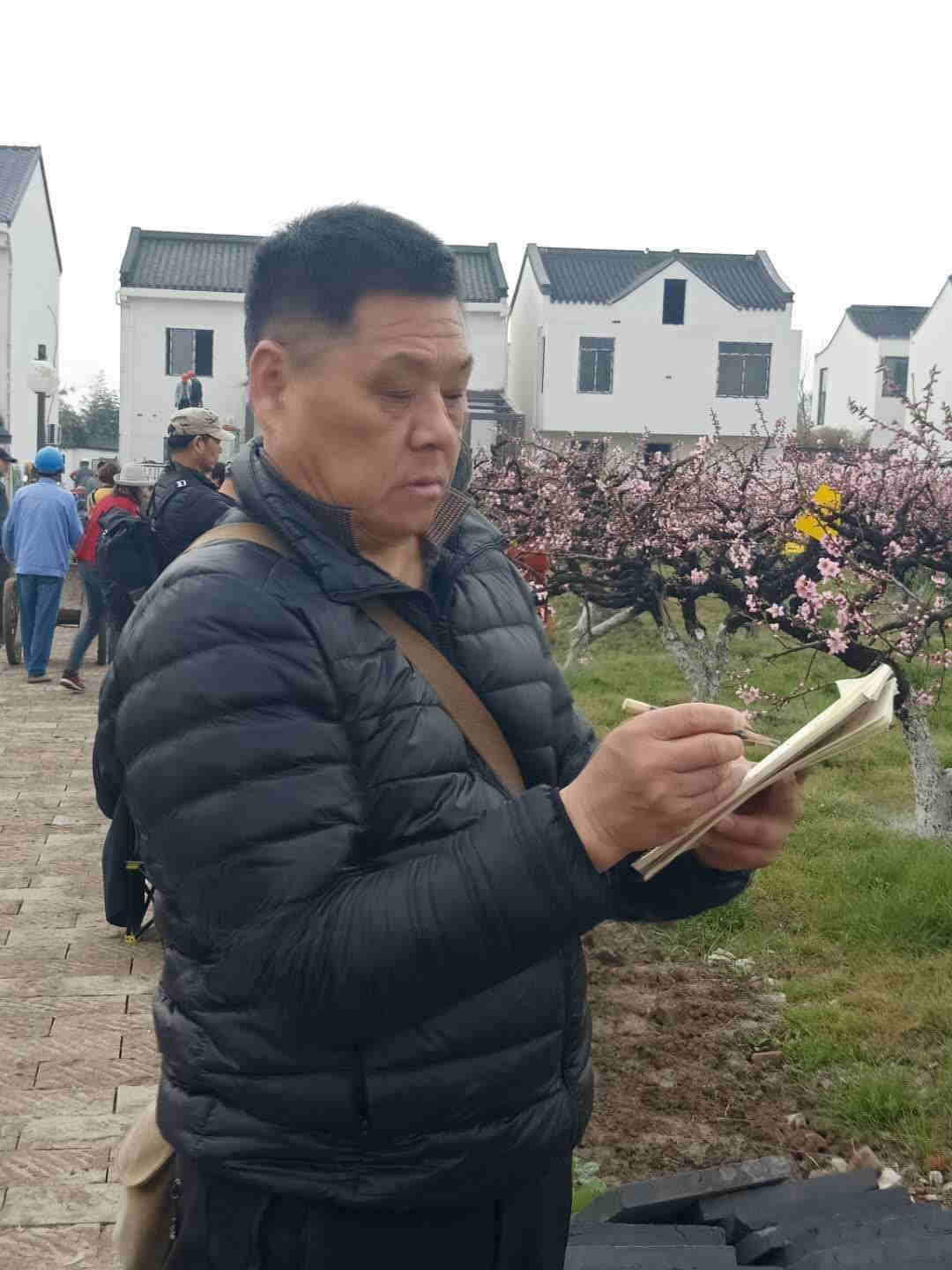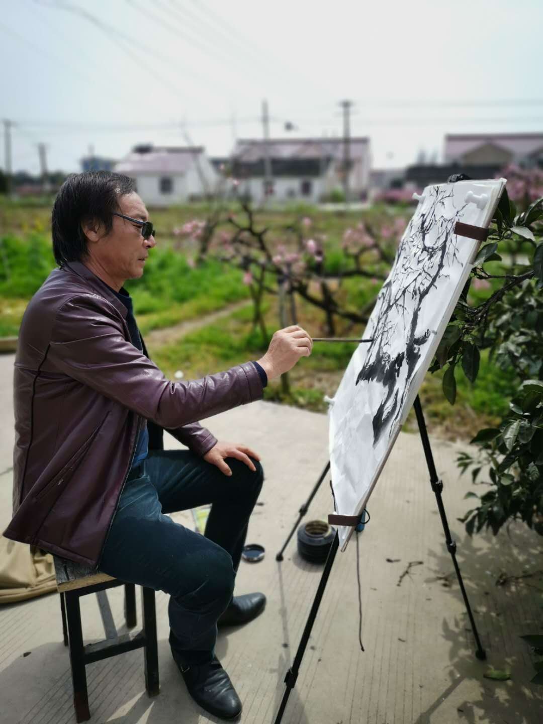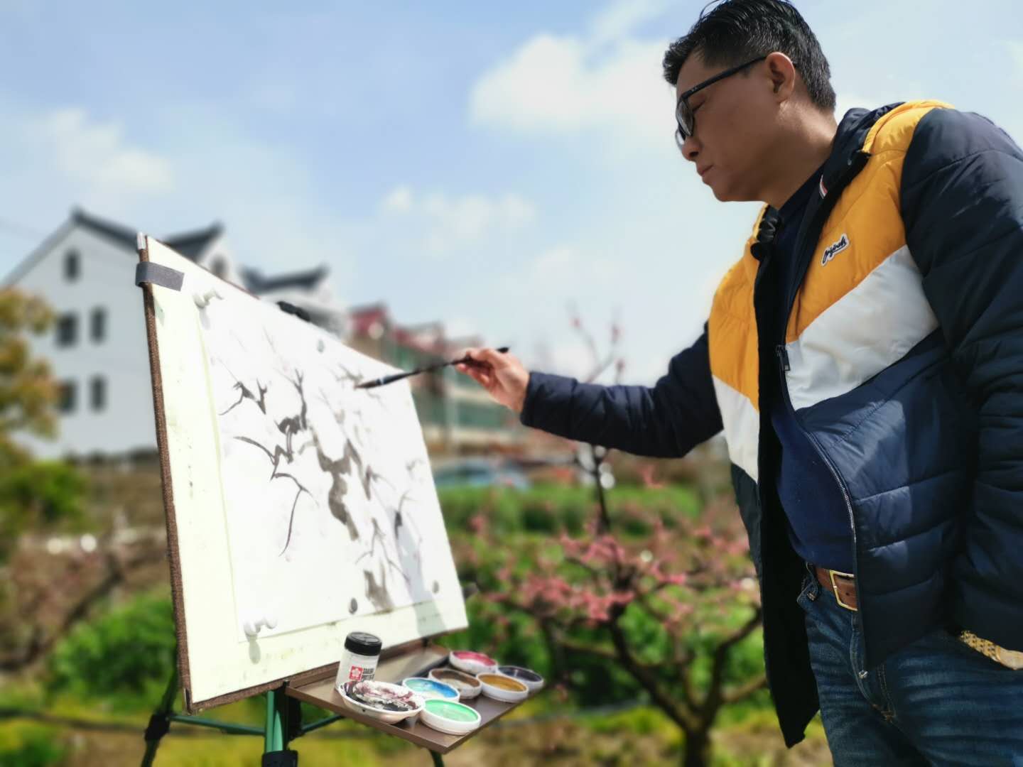 上海市美术家协会副主席陈琪老师27日冒雨就来到吴房村写生,看着桃花、看着吴房村的美丽乡村,两天时间画了20幅桃花主题作品,市美协海墨画会应鹤光会长,在宝山区美协副主席、海墨画会副会长王鹏老师的陪同下,28日一早赶来了,一下车,站的田边不走了,应老师说:这里的桃花非常的美,到处可以画,我就从这里画起。陈琪、应鹤光、王鹏他们三位老师在两天的时间里创作写生的许多作品,奉贤区青村镇的肖主任多次来看望和关心先期来写生的老师,奉贤区美协主席李钟、副主席乔晓燕27日一早也来到吴房村现场,看望陈琪老师。