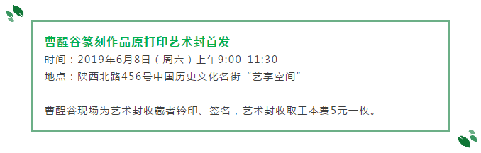 今年6月8日是第十四个中国文化和自然遗产日,陕西北路中国历史文化名街“艺享空间”特邀篆刻家曹醒谷携篆刻作品原打印与广大喜爱中国非物质文化遗产的篆刻爱好者见面。