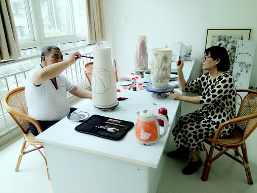 画家夏建峰:尽管外面的天气闷热,但是当走进现代御窑的工场车间,看到大大小小,造型各异的胚子,有釉下彩、釉中彩、还有釉上彩,在这个环境下,创作欲望一下子就起来了。