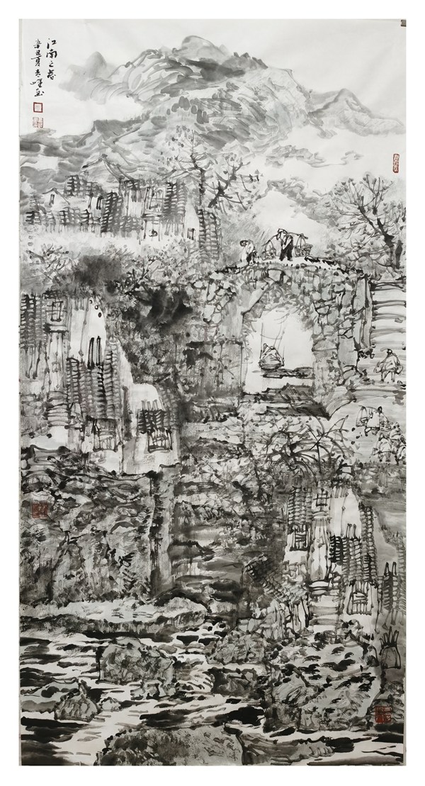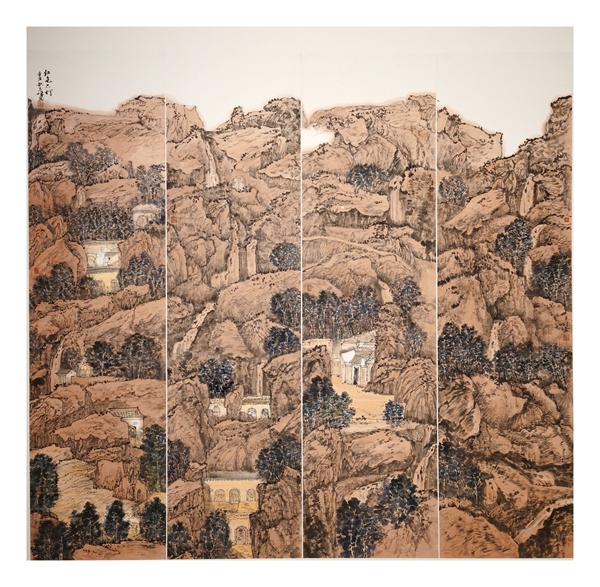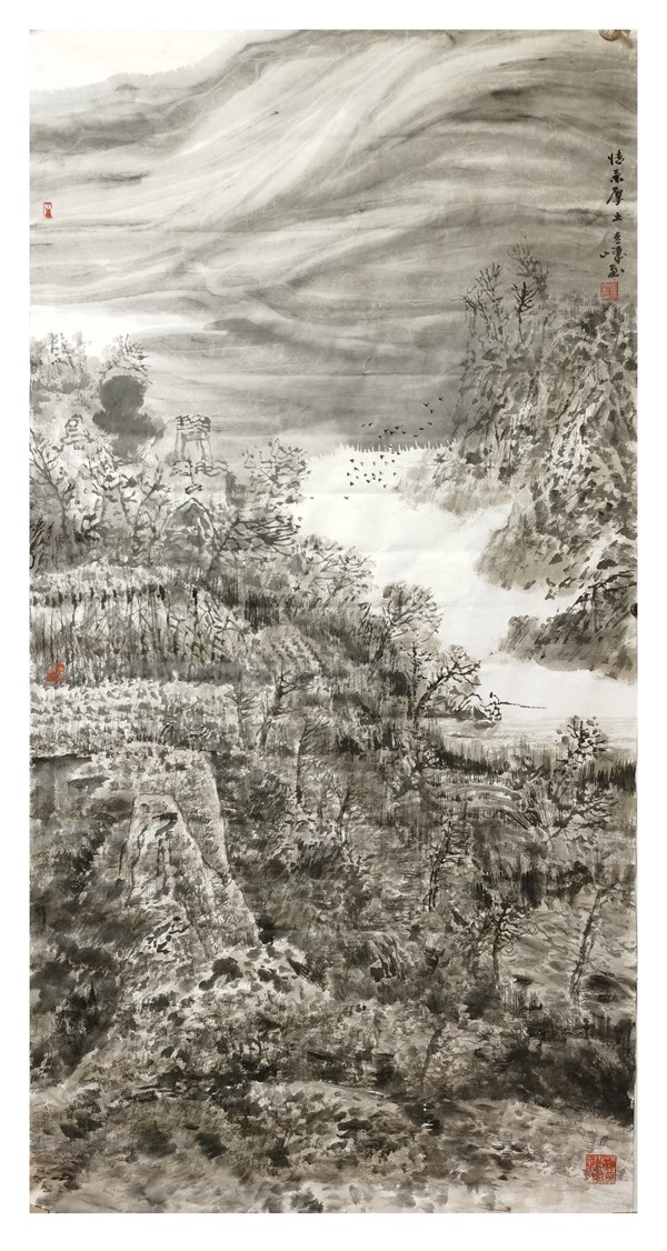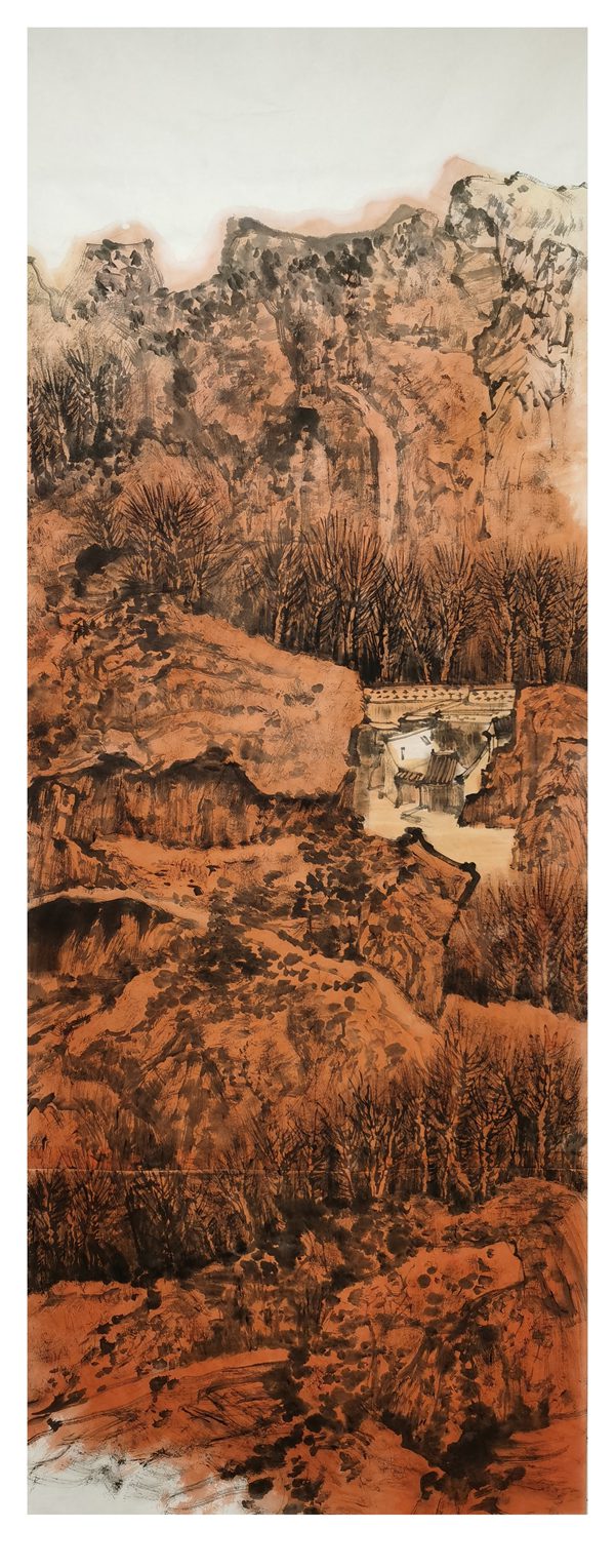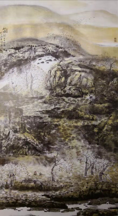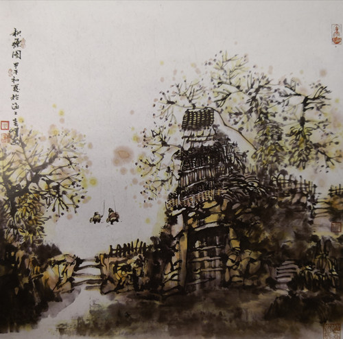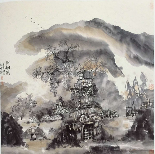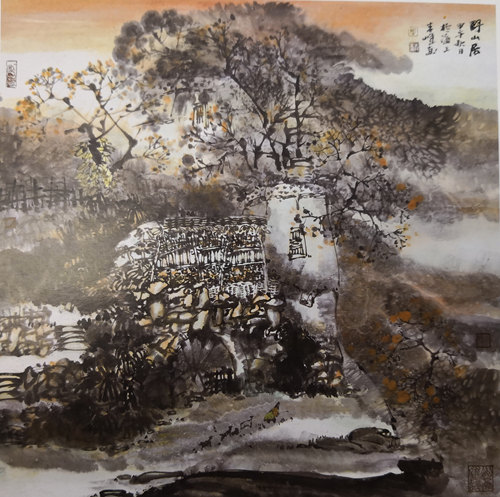 周青峰师法自然,以水墨写自然,以四季情节走访自然。在周青峰的世界里,隐藏着艺术家对古文化的深刻追思,无论在物质生命还是精神生命中,他的作品都具有一种深沉和明确的力量,散发着一种可再生可重来的精神气氛的能量。山水画是世界艺林中独特的风景,它伴随着中国艺术走过了最为辉煌的历史时期,在与自然的和谐顾盼之间,艺术家的艺术作品与山河大地融为一体,在获得独立生命的同时成为一个实体,无论在艺术作品的物质生命还是精神生命中,它都成为了一种明确的有符号有诉求的力量,它将存在着并且具有创造精神世界敏感醒悟的能量。读周青峰作品《秋山无语》,在那感动的色彩里,我看见房前屋后满树的累累果实,听见竹篱茅舍边淙淙的泉响,慢调而从容的展示成熟的味道。这样的美景良辰,更适合闲庭漫步,无言地陶醉在无边的秋日中。老庄的哲言在耳畔悠然回响:致虚极,守静笃。这种深邃的成熟美,一定是具有诗人的敏锐和哲人的灵犀才可以在古色古香的画面上展现。