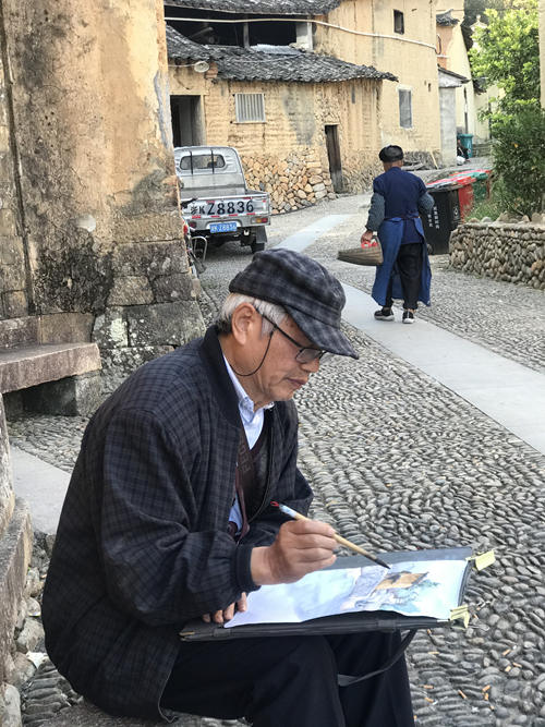 见面不亦乐乎。在水一方一边吃着早歺,一边商议写生事项。今日画乡小镇摄影大赛,人多写生不便,我们决定去外斜一带村落……