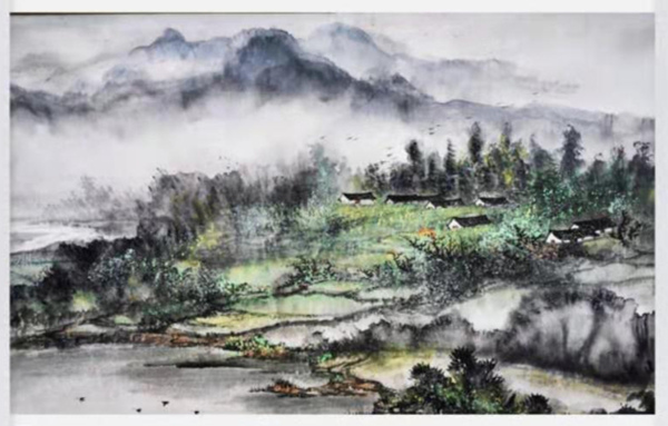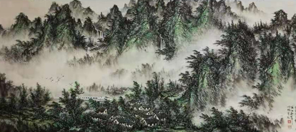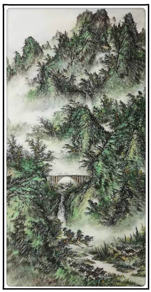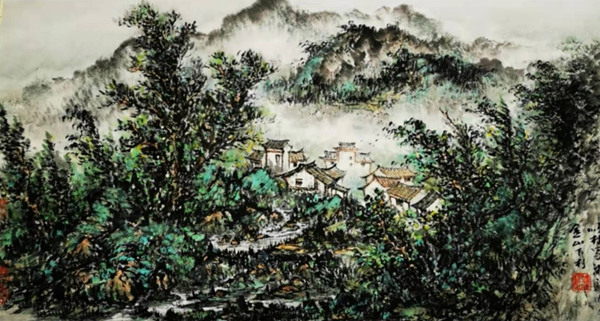 朱顺林画山水,既有传统的写意精神,又有自己的写实技巧,在烟岚层叠的画面中,精心营造着理想的世外桃源。他的山水,可望、可游、可居,其中的村舍错落,小路蜿蜒,溪流潺湲,云蒸霞蔚,仿佛人间仙境,让观者不禁神往。这是远离大自然的都市居民共向往之的所在,而这种向往恰恰体现了现代人久违了的欲与自然天地融为一体的远古情节。