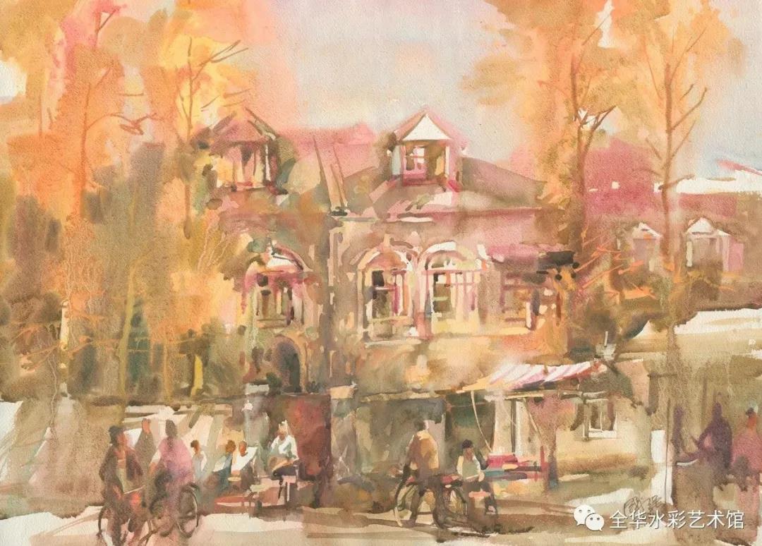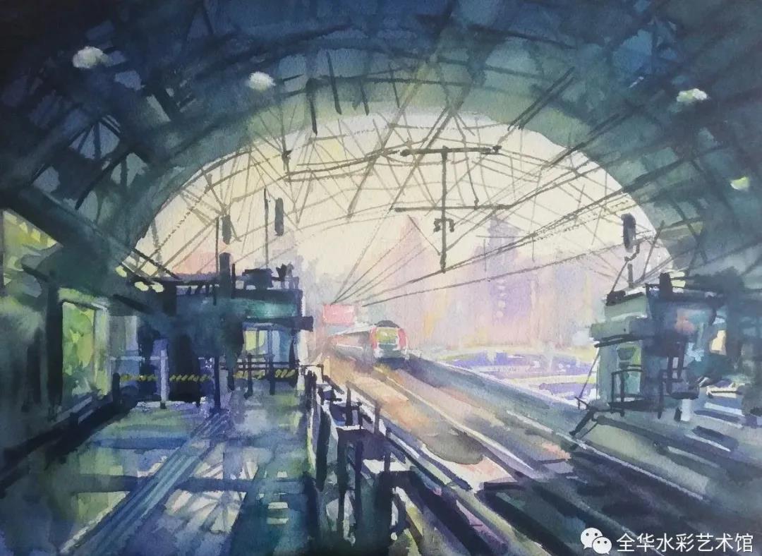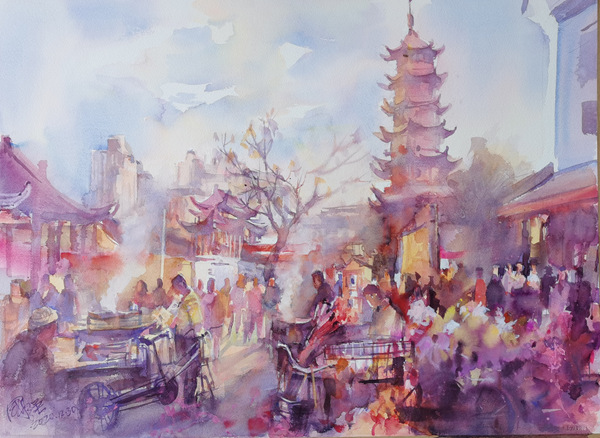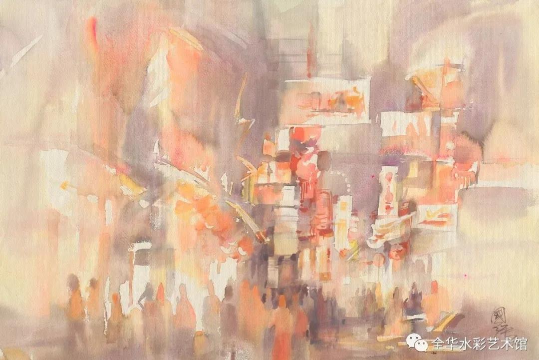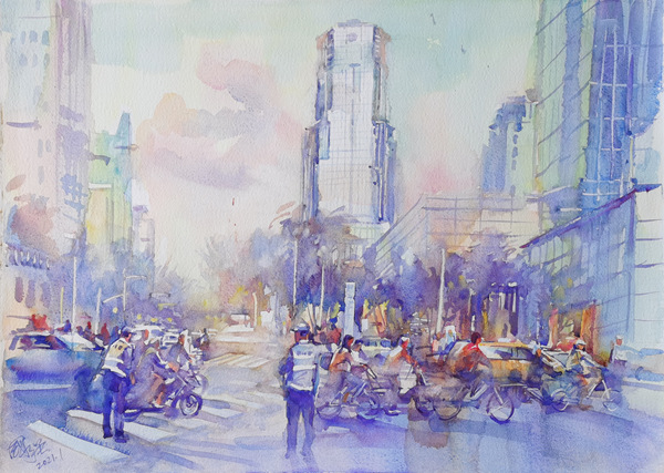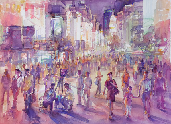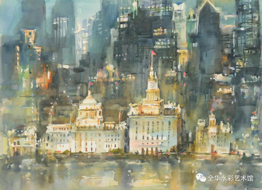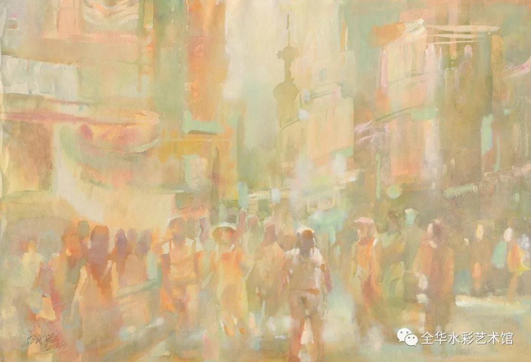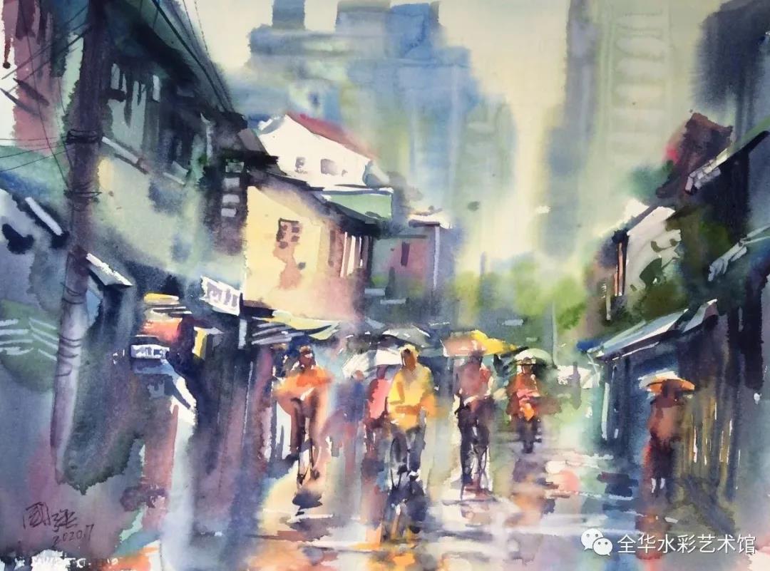 国强兄长期从事美术创作和培训组织工作,競競业业投入大量精力,令人钦佩。但他从未放弃对自己钟爱的水彩和版画艺术的追求探索,尤其退休之后有更多时间去写生和创作,不断有作品在各种展览亮相。他将国内外城市景观作为重要的表现课题,其中许多不仅仅停留在建筑的再现,而以芸芸众生的普通瞬间占了主要画面,他觉得城市因人而有生命,因人而有历史!多年来逐步形成自己的绘画语言。这次上海全华水彩艺术館为他主办个人水彩画展,展出从1964至2021年逾越57个春秋的50余幅写生和创作的上海题材作品,我们仿佛在流淌的水痕中、在变幻的光影中、在亮丽的色彩中阅读一位老上海人的一个个上海故事和一段段故乡情怀……