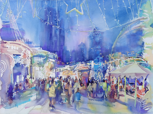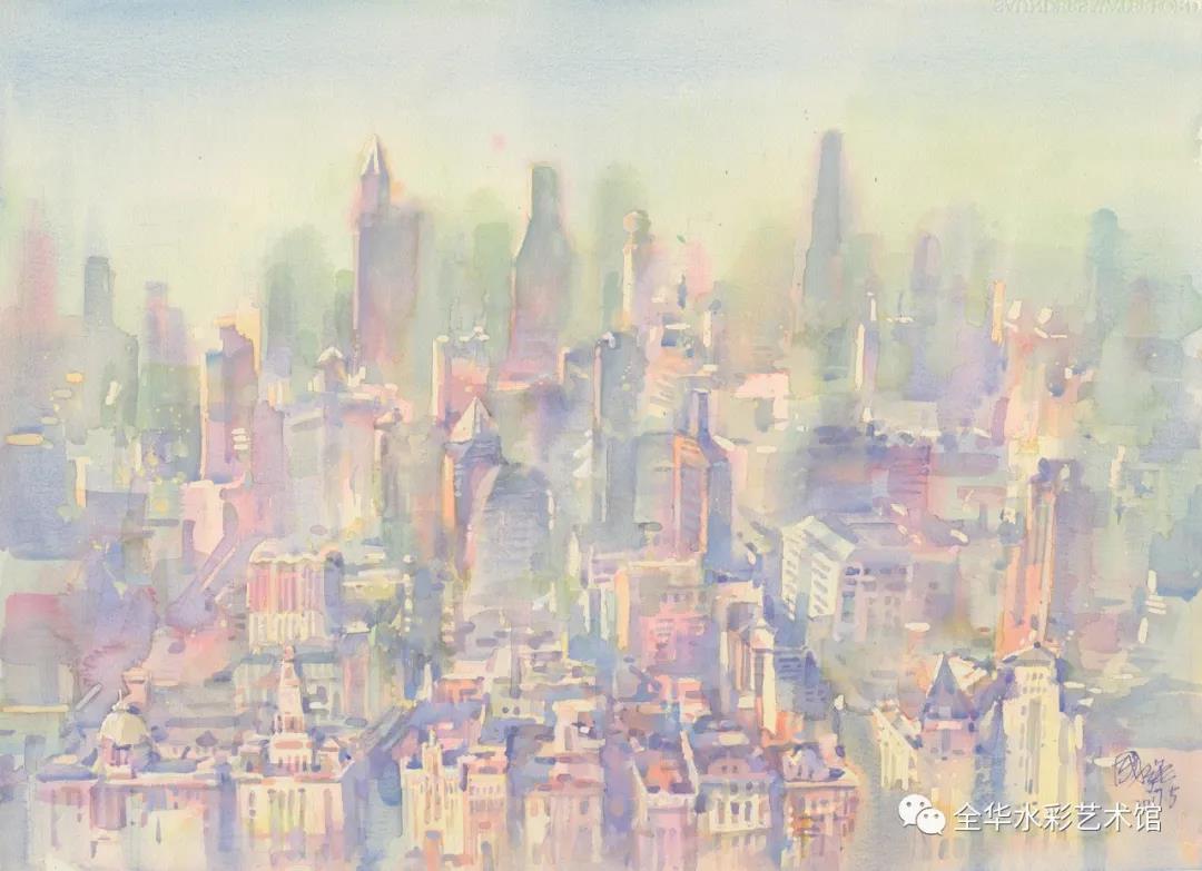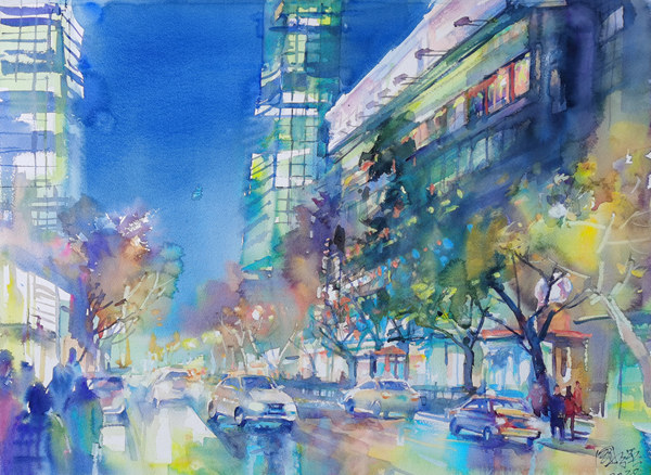 本次展出的五十余幅水彩作品,大都是现场写生,而且创作时间跨度较大,他的水彩作品色彩艳丽、构图饱满、滋润灵动,让我们有幸看到了几十年来画家的经历、学识、阅历和情感。作品中呈现的一个土生土长的上海画家,不浮夸、不做作、为人厚道、低调处事,对养育自己的城市满腔热情。城市景观、城市生活始终是他关注的题材,常常为了同一题材反复创作数幅作品。不论是石库门、老洋房、弹硌路、小弄堂还是当代的摩天楼、高架、休闲绿地等无不都以水彩画特有的鲜丽、通透、千姿百态地记录在他钟爱的纸上,给我们留下了珍贵的观赏记忆,也鞭挞了那些画中一味媚俗、自吹自擂、沽名钓誉的作品丑陋与悲哀!这就是“画如其人”,一个响亮的名字“国强”作品!