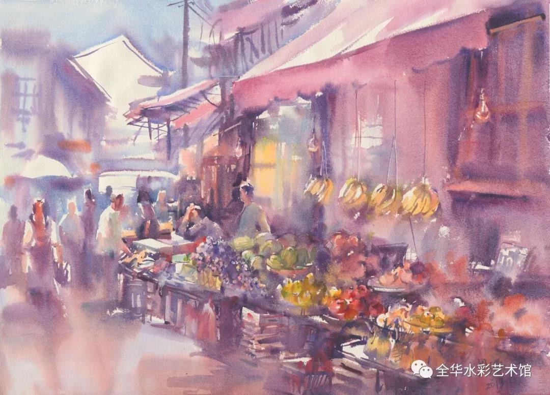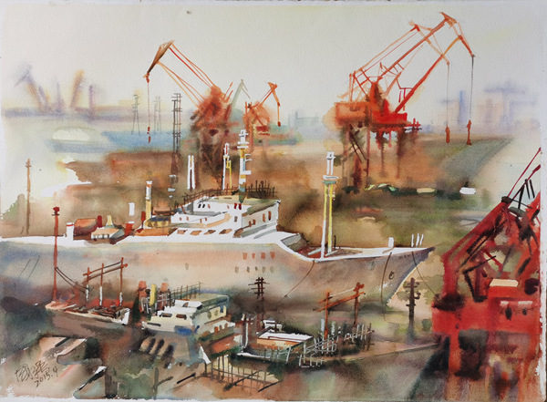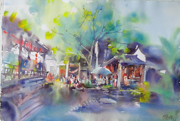 我同国强先生相识于2017年,应水彩画大家陈希旦先生的邀请,我们一起赴香港为香港回归20周年庆采风,同去的都是上海水彩画界的大家,国强先生则是最年长的。那时正值高温,采风要顶着烈日到处奔波,且身上还要背着全套写生的行囊,每天都在徒步中选景,白天、晚上、渔岛、村落,真可谓一点都无法怠慢。几天下来,国强先生的腿疾旧伤复发,行走艰难,但是他始终坚持,从未掉队。每到一处,立即选景,展开画架立即写生。那是我首次看到了国强先生对绘画的钟爱和一个画家敬业的风范!也吸引了不少粉丝,在现场围观。以后我们又应上海宋庆龄基金会的邀请一同去了安徽、广东等扶贫项目地采风,彼此交流、切磋、讨教技艺的机会多了,更进一步增进了了解。
