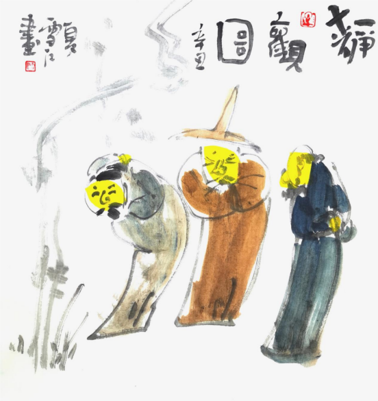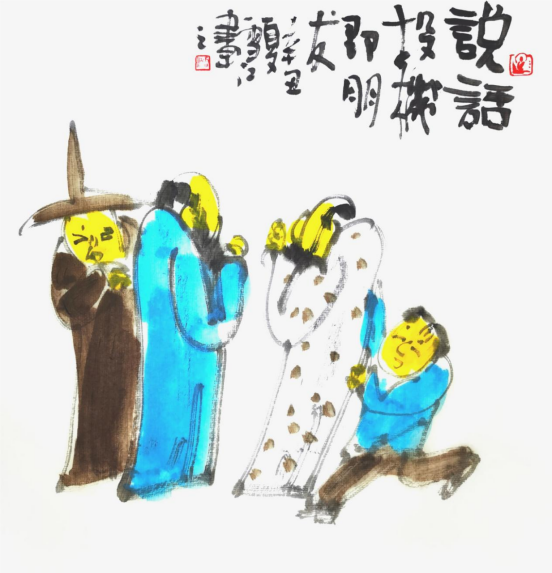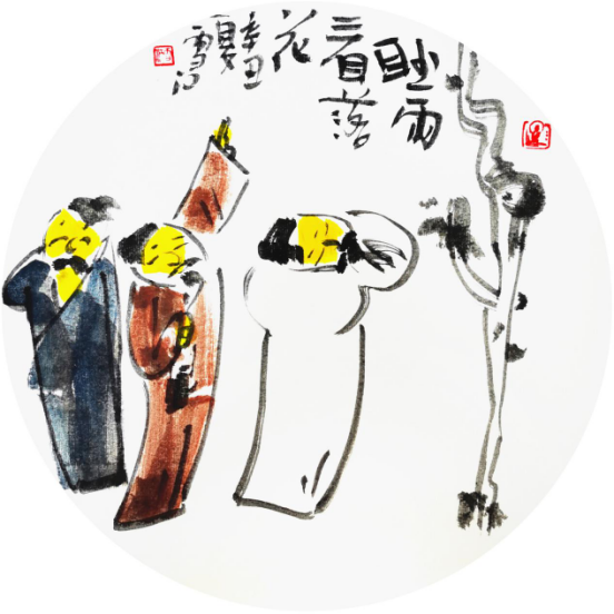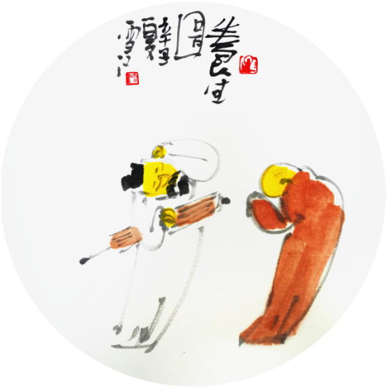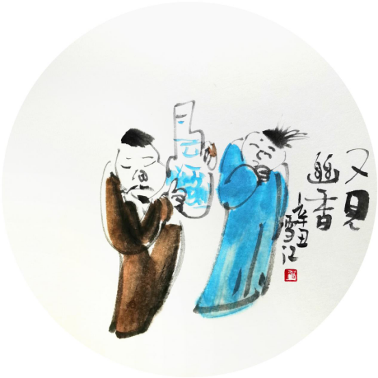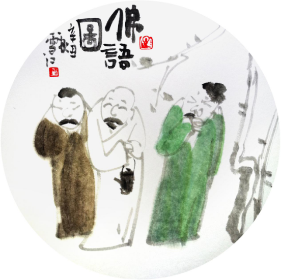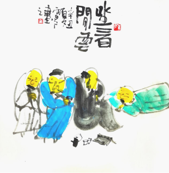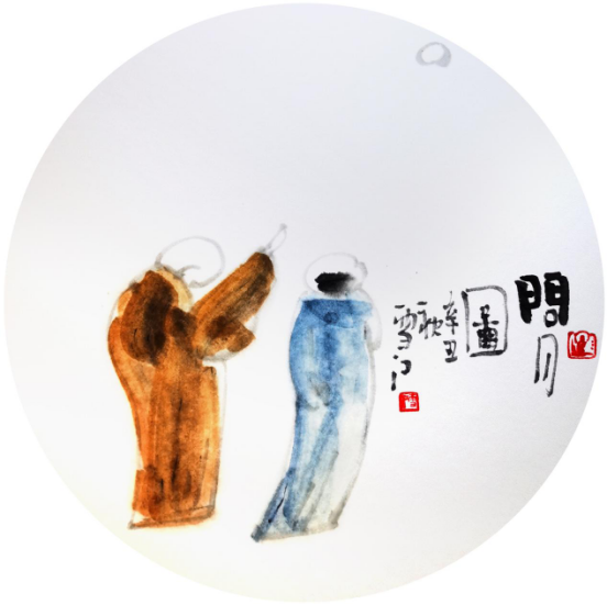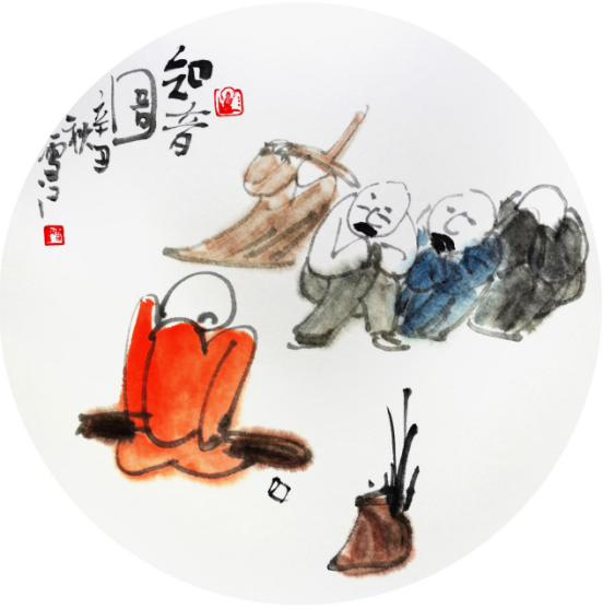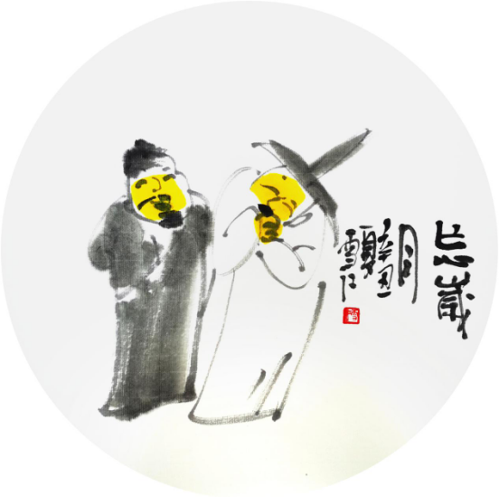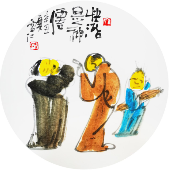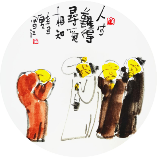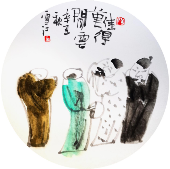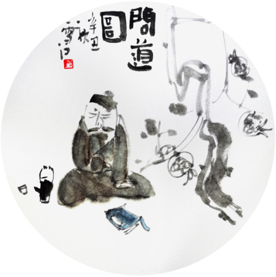 沈雪江对传统有着清晰的认识,不盲从于各种风生水起的流派与风格,不迷信舍弃根本的创新,源于对传统的自信,使他自觉选择了这样一条道路。“自有我在”另一个层深意是在艺术创新方面,就艺术本体而言,他的水墨人物画经过多年的锤炼,形成了独特的绘画语言,以鲜明的艺术个性与古人和时人拉开距离。石涛“古之须眉不能生我之面目,古之肺腑不能入我之腹肠。我自发我之肺肠,揭我之须眉……”即是强调鲜明的艺术个性,凸现艺术创新的重要性。沈雪江的水墨人物没有舍弃笔墨,在续接传统的基础上,以别具意趣的人物造型,淡化书写性的笔墨,自出机杼。细读之,沈雪江的水墨人物画重意趣,重表达,画面中的水墨人物造型稚拙奇特,有非常高的辨识度,他努力抛弃经由多年系统训练而获得的熟练的人物造型能力,他笔下的人物往往头大身圆,面部五官以极为简练的笔墨写出,奇拙高古,略带夸张诙谐的意味。人物线条流畅迅疾,不纠结于用笔的顿挫穿插,这种简率反而别有意趣,自然而然,也是树立个人风格的关键。毕加索曾说过:“我努力毕生追求的,就是如何像个孩子那样画画。”这种稚拙奇特的造型,是经历了先由生到熟,再由熟到生的过程,去除一切机巧,信笔写出内心感受。