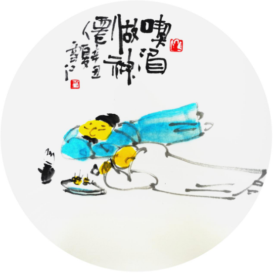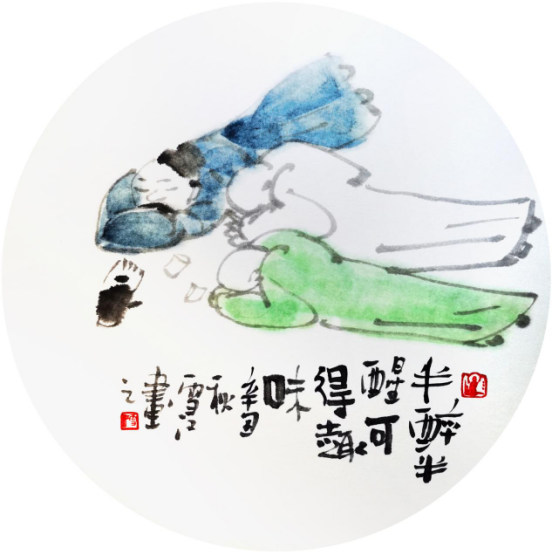 笔墨简逸是沈雪江水墨人物的另一特点,无论是人物的塑造还是补景,都呈现出逸笔草草、形略而迹简的倾向。他以最朴实的笔墨语言来呈现最简洁明了的图式,体现最天真的意趣。不炫耀笔墨技巧,不炫耀造型功底。体现造型能力的人物动势,复杂的衣纹结构,手部结构,这些原本可以大费周章炫技的部分,在他的画面中都以最简单直接的方式得以解决。他有意弱化书法性用笔,在描绘人物的身体时,删繁就简,线条往往一掠而过,不拘泥于笔法的多变与精致,更利于直抒胸臆,使笔墨转化为自由表达的工具。笔墨简逸并不等同于简单空洞,他的人物五官刻画生动有趣,表情丰富,以眼传神,体察精微,增加了很多趣味性和可读性。