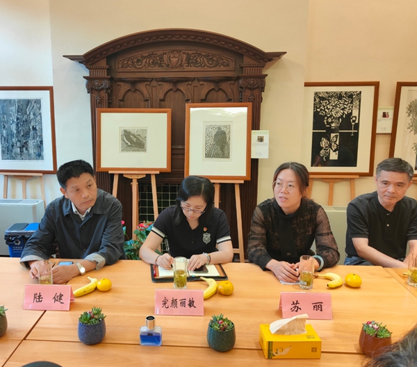 版画家李琼莲老师发言:不管身在何处,都不忘记我的家乡,要举一举家乡的旗帜,尽管离家已经多年,仍然对家乡记忆犹新,我的创作内容都来源于对家乡熟悉的生活环境。