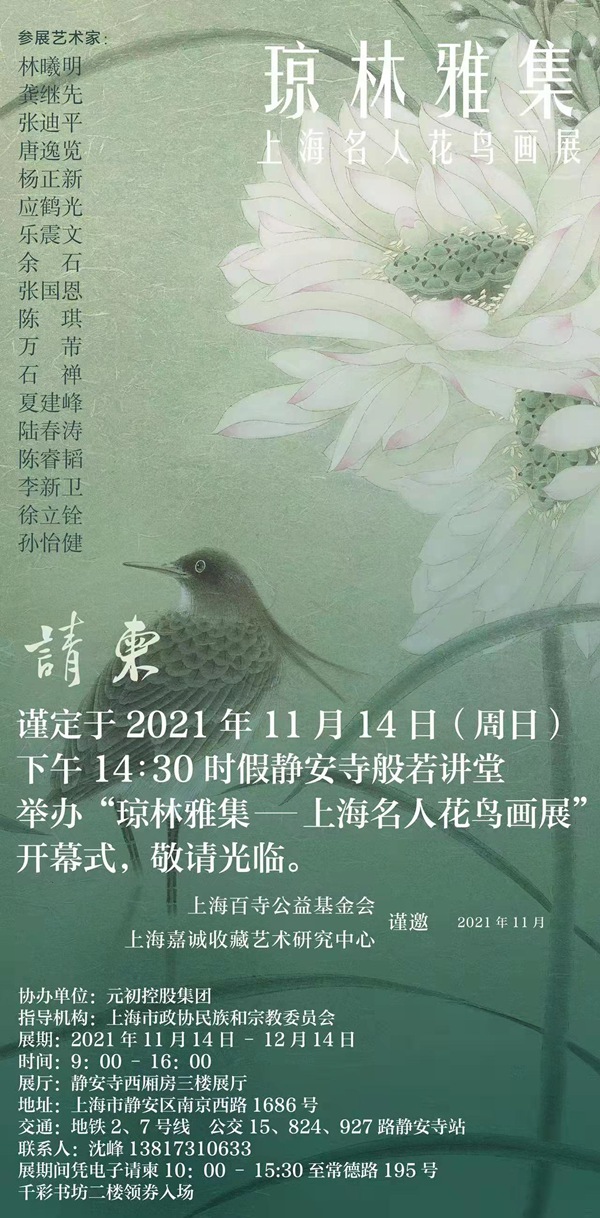 谨定于2021年11月14日(周日)下午14:30时,假静安寺般若讲堂举办“琼林雅集—上海名人花鸟画展”开幕式,敬请光临。